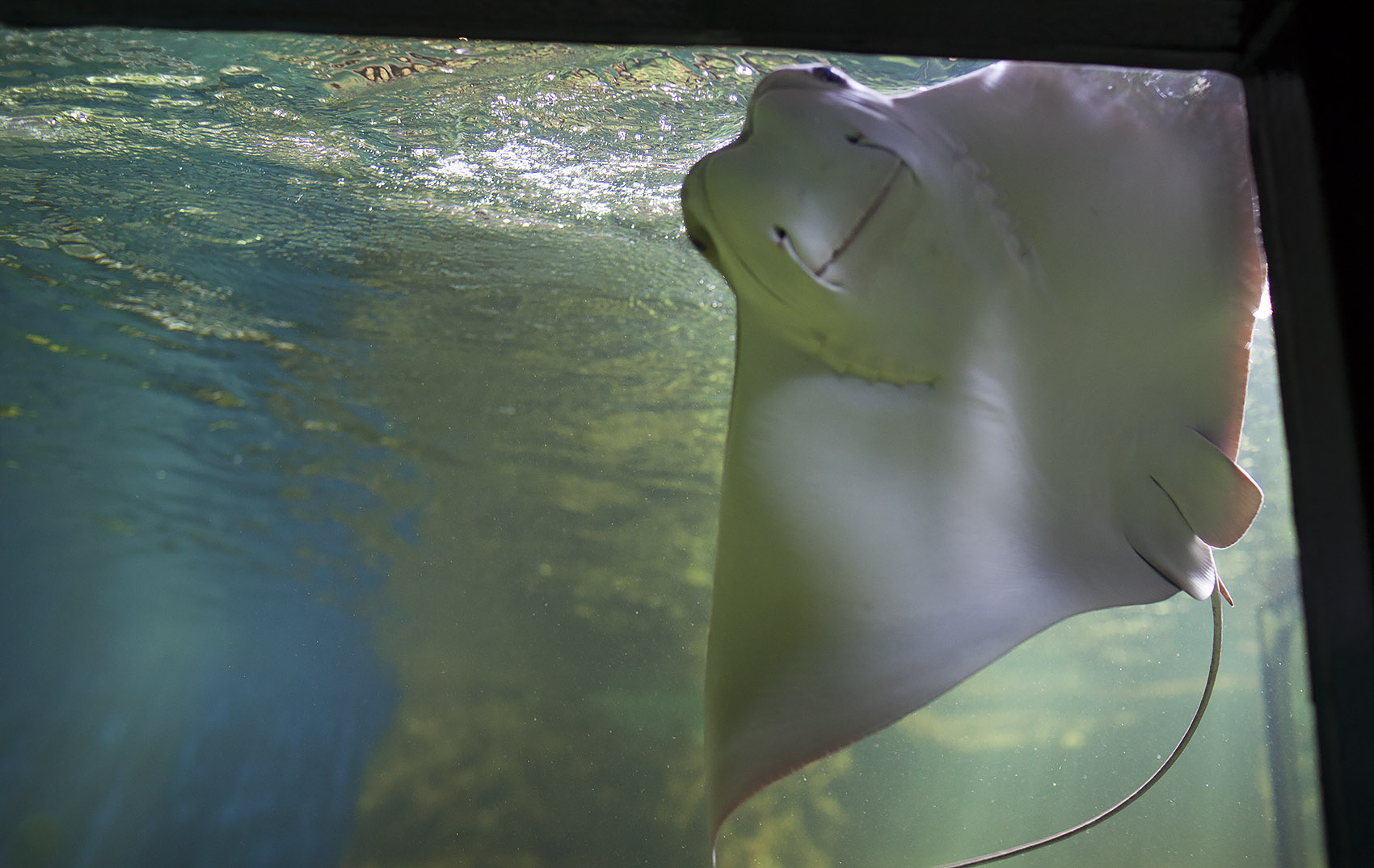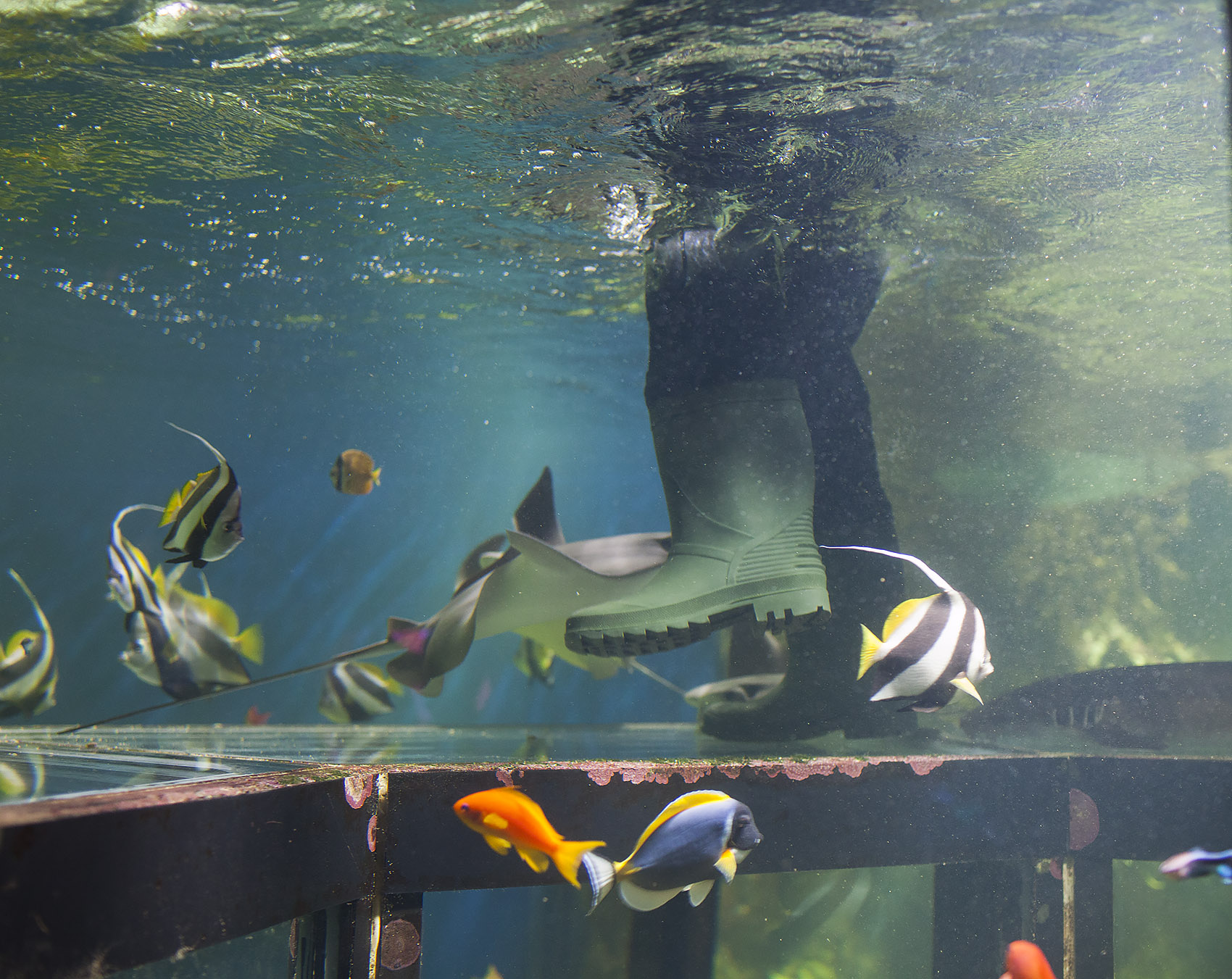 Bilder från Stockholm: En man stiger ner i Aquariet för att mata rockorna. (2017-06-20)