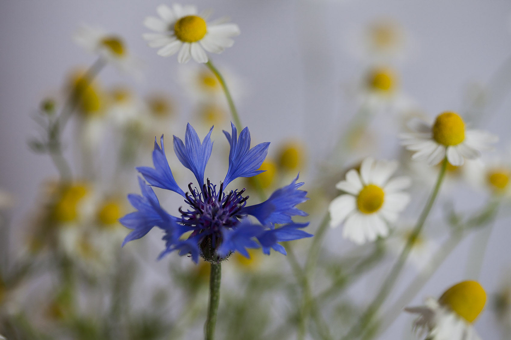 Vi behövde litet blåklint. H:s pappa fick alltid en bukett på sin födelsedag den 1 juli och nu skulle vi äta en lunch till hans minne; han skulle ha fyllt 100 jämnt i år om han ännu levt. I södra Roslagen finns det numera mest bara 20-årsvallar eller äldre och där hittar man inga blåklint, däremot maskrosor, kråkvicker, hundloka, älggräs, osv, och det är väl bra det med; men som sagt inte blåklint. Dem brukar vi plocka i en spannmåls- eller oljeväxtåker om vi har tur – dvs. om man missat att bespruta ett hörn. Räddningen i år blev en åkerkant vid Ullna gård, intill norra infarten i Arninge, där man lämnat en del av åkern utan ogräsbekämpning. Här lyste det blått när vi åkte förbi på väg till Norrtälje; på hemvägen körde vi av från motorvägen, parkerade och krånglade oss förbi viltstängslen ut till blåklintsåkern. Där växte även kamomill – jag har inte tänkt på hur vacker den blomman är. Kanske finns där även en del annat av botaniskt intresse, men tiden räckte bara till en vacker bukett med blåklint och kamomill! (2017-07-03)