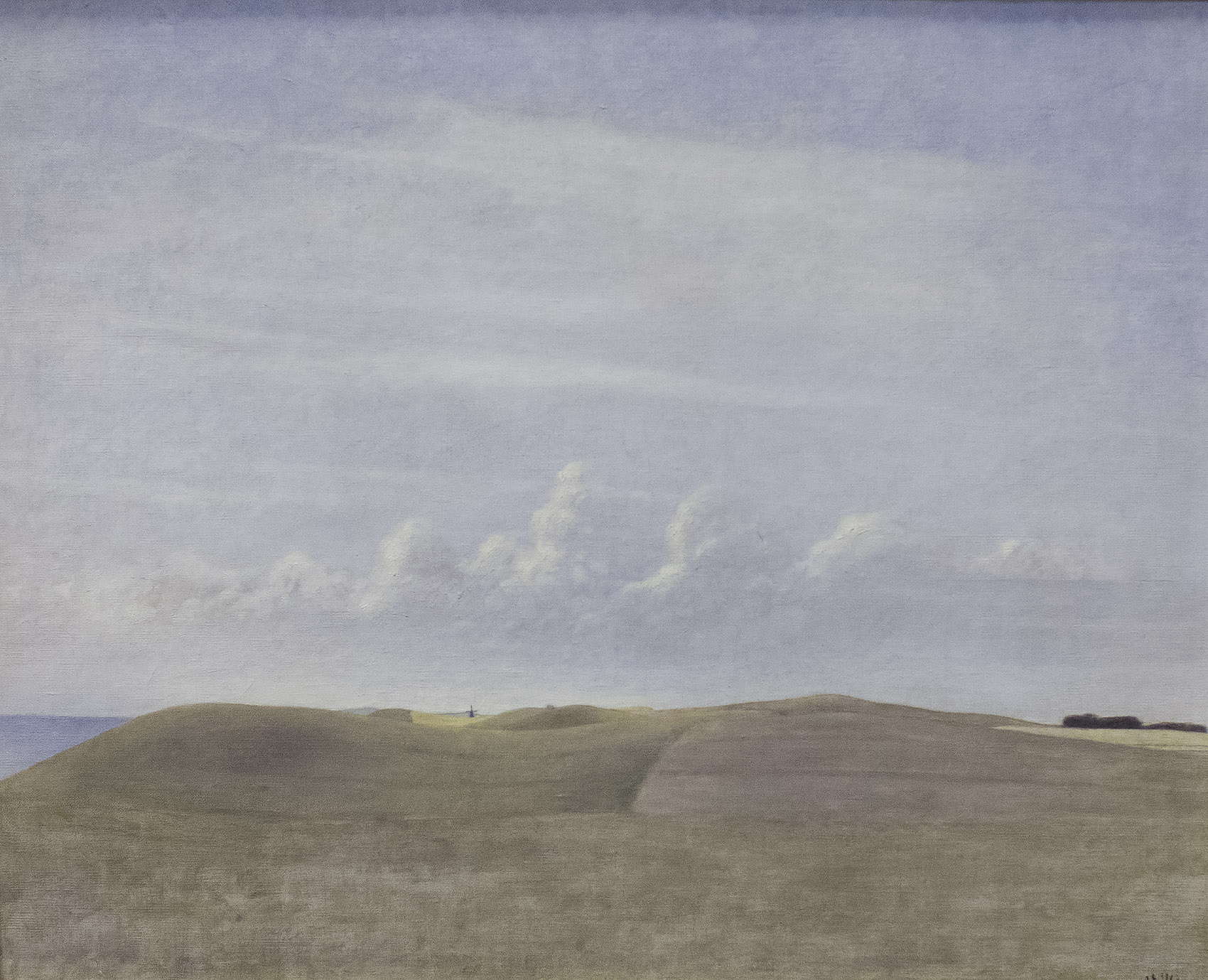 När man nu är på Thielska galleriet och har blivit inspirerad av Helga Henschens verk orkar man säkert med några målningar ur museets egen, storslagna samling. En Carl Wilhelmsson, till exempel hans "jordarbetare, Uppland" från 1904 med sin litet ovanliga komposition, ett snävt utsnitt, jag undrar var den är målad, Uppland är stort; jag gillar den: motivet, färgerna. Eller varför inte en Munch: förutom en variant av "Skriet" och några andra klassiker har museet också en av hans landskapsmålningar, här "Åker i snö" från 1907. Den är fin. Tycker man om Liljefors harar och rävar och ejdrar så har de sådana också, liksom Fjaestads snömålningar och Eugen Janssons nakna karlar och Zorns lika nakna kvinnor och blåmålaren Janssons Stockholmsmotiv och, för att återvända till de riktigt stora, flera Hammershöi, här ett av hans "Landskap" från 1900. Osv, osv.