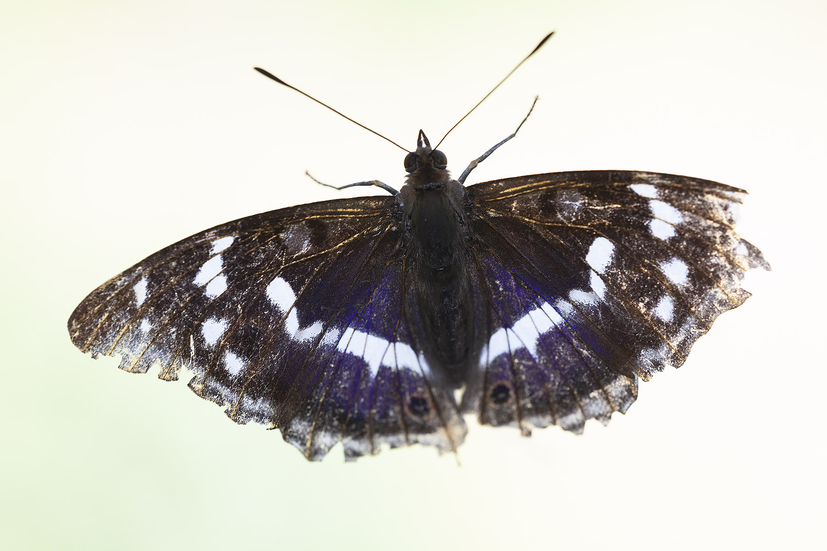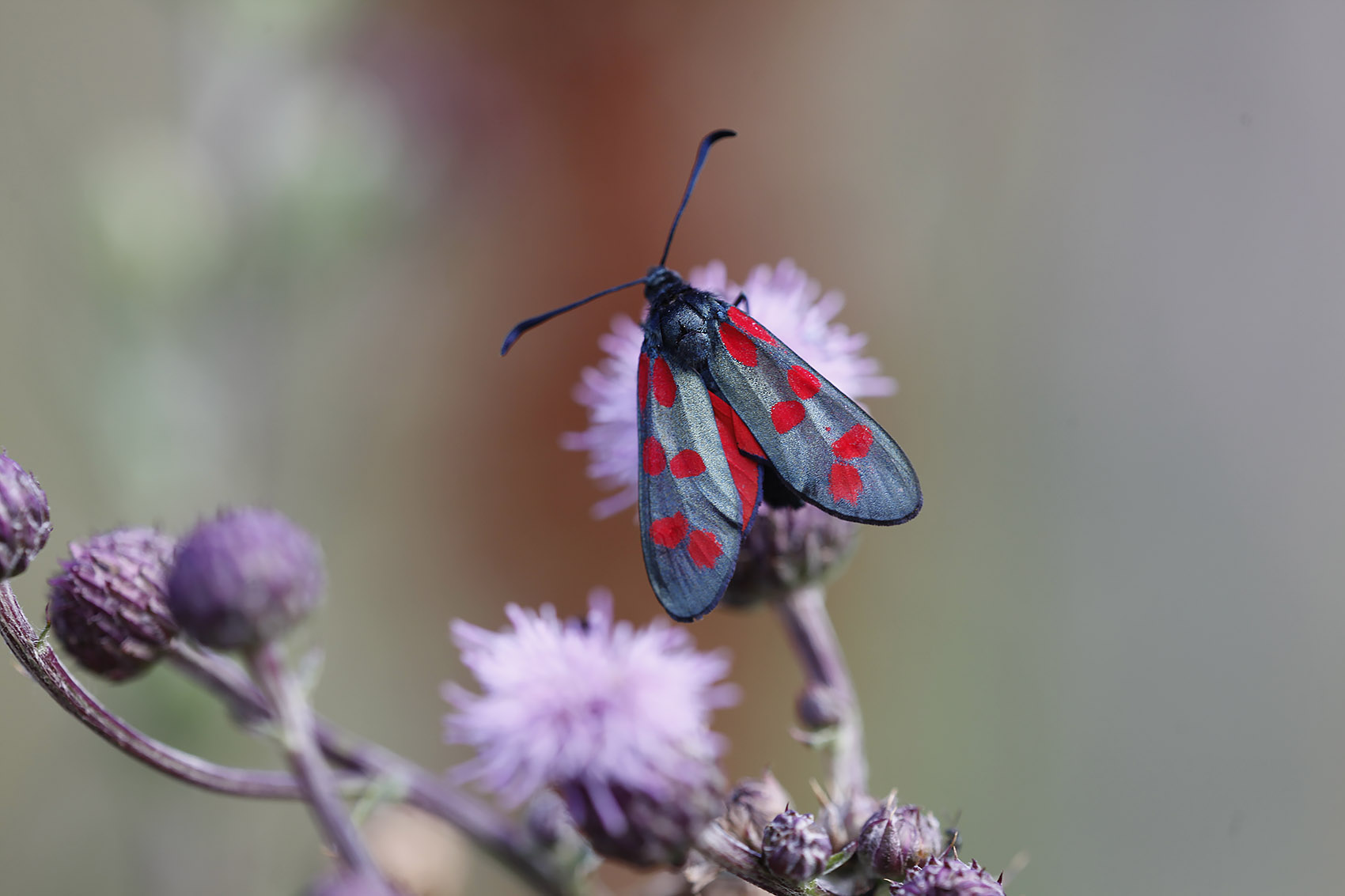 Den sexfläckiga bastardsvärmaren sitter ogenerat och suger nektar på åkertistel vid Storängen, Råby Rönö s:n i Södermanland. Till skillnad från de vanliga fjärilarna, sommarfåglarna, är bastardsvärmarna orädda av sig och sitter snällt kvar när forografen vill ta sina bilder.