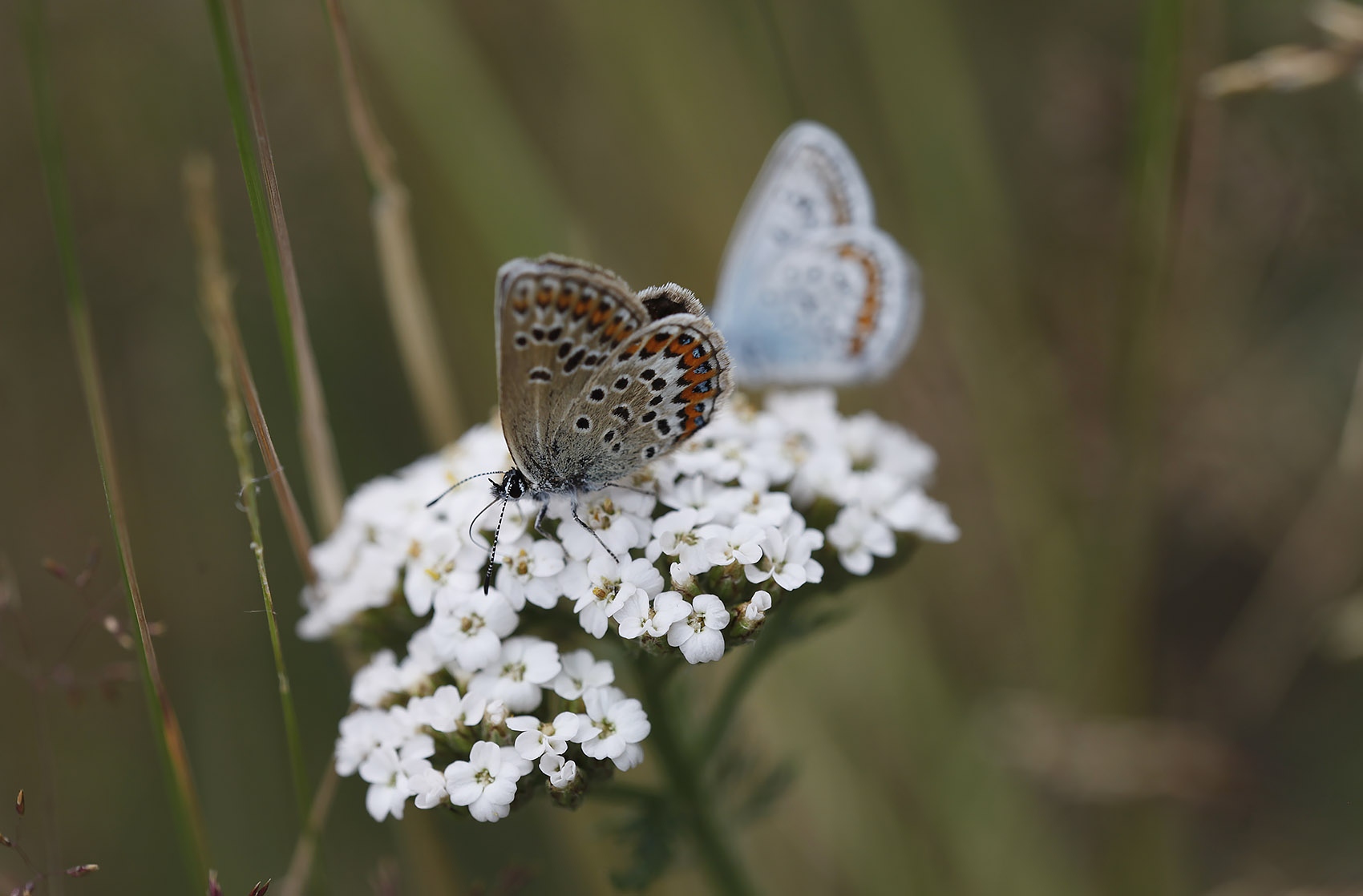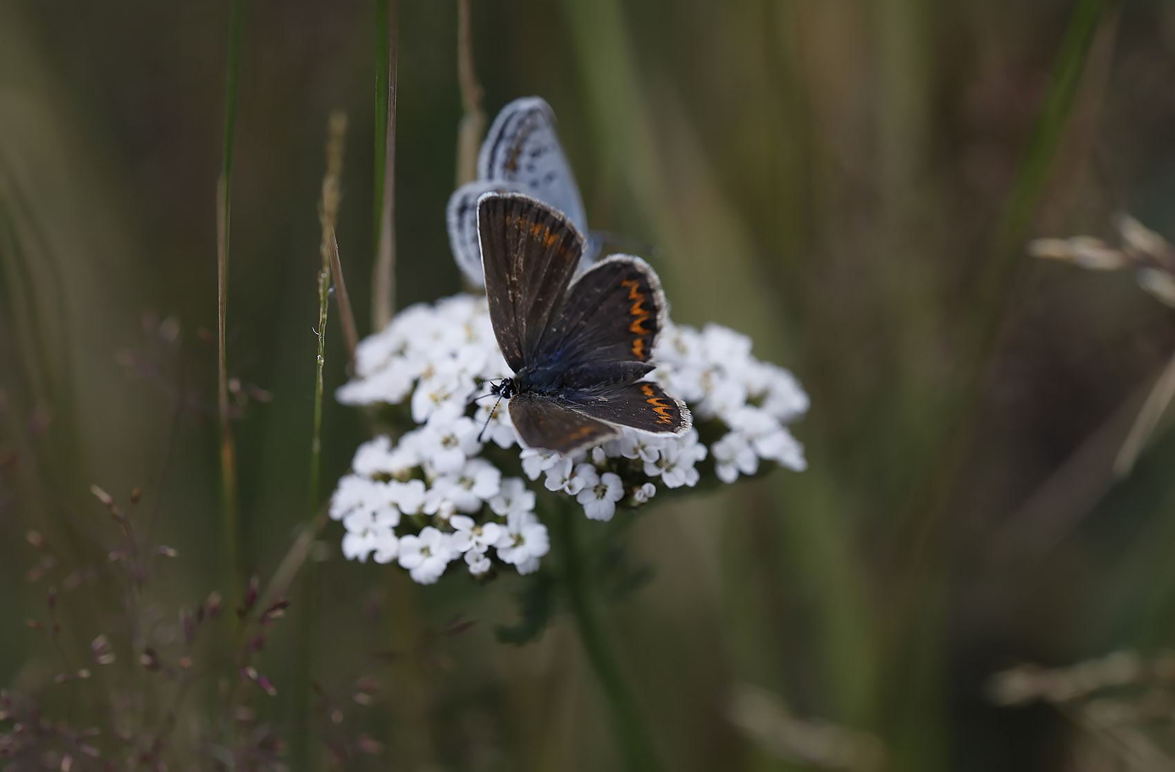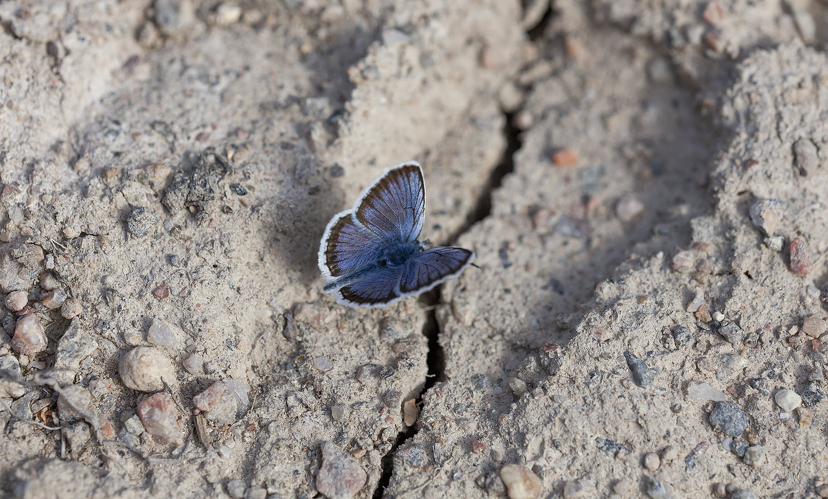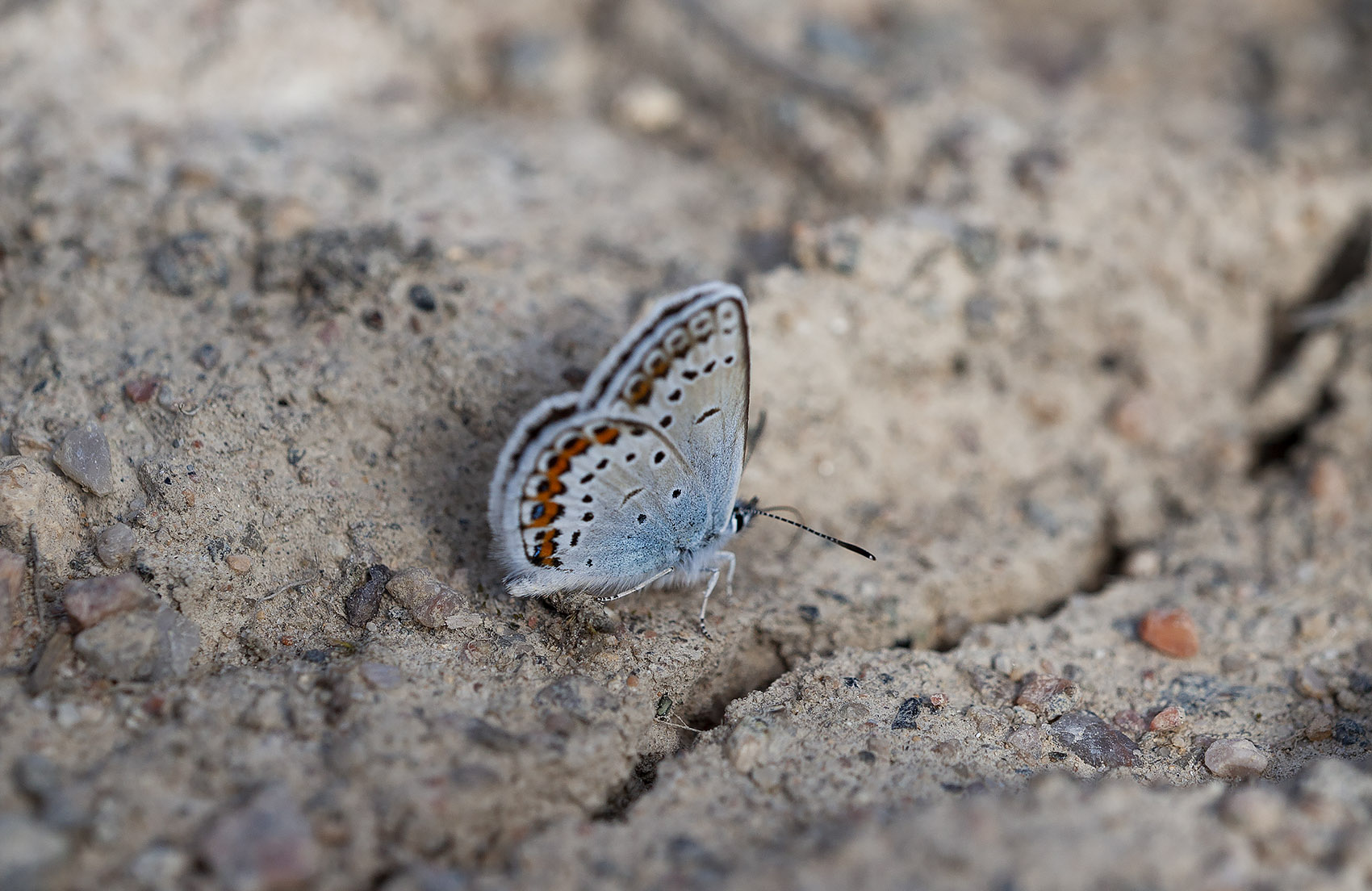 Gick en tur i värmen upp på Fjällveden, till Arvkärret och Hästmossen, ett nytt försök att få se några av de myr/mossebundna fjärilsarterna; men det fick jag inte. Om man nu inte ska räkna ljungblåvingen dit, de satt på de fläckar med naken jord som rådjuren (?) sparkat upp runt några martallar ute på Arvkärret. Och på röllekorna, som är nästan de enda blommorna längs de här skogsbilvägarna. En gulsparv sjöng i den gallrade tallskogen och fyra tranor stod längst bort på Hästmossen, det såg ut som att två av dem var ungfåglar, men det var litet för långt håll för min lilla kikare. (2018-07-10)
