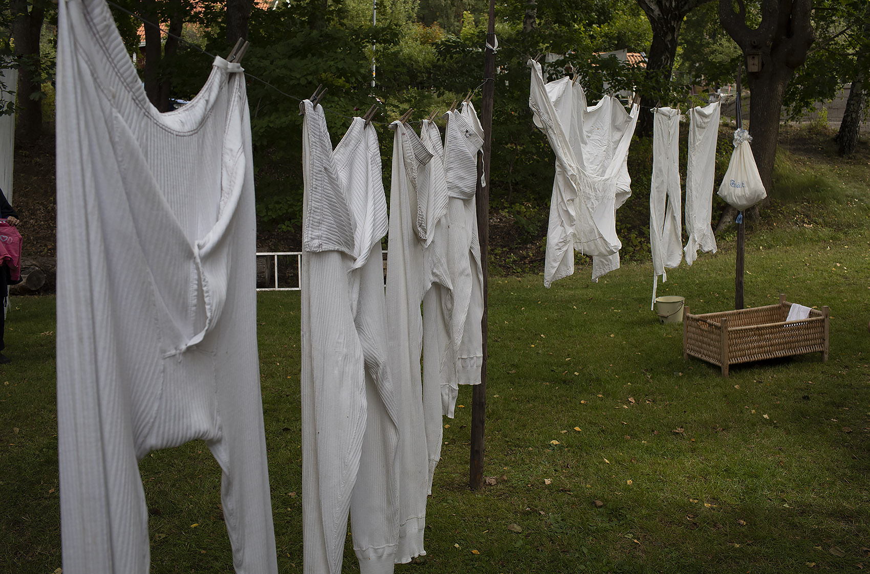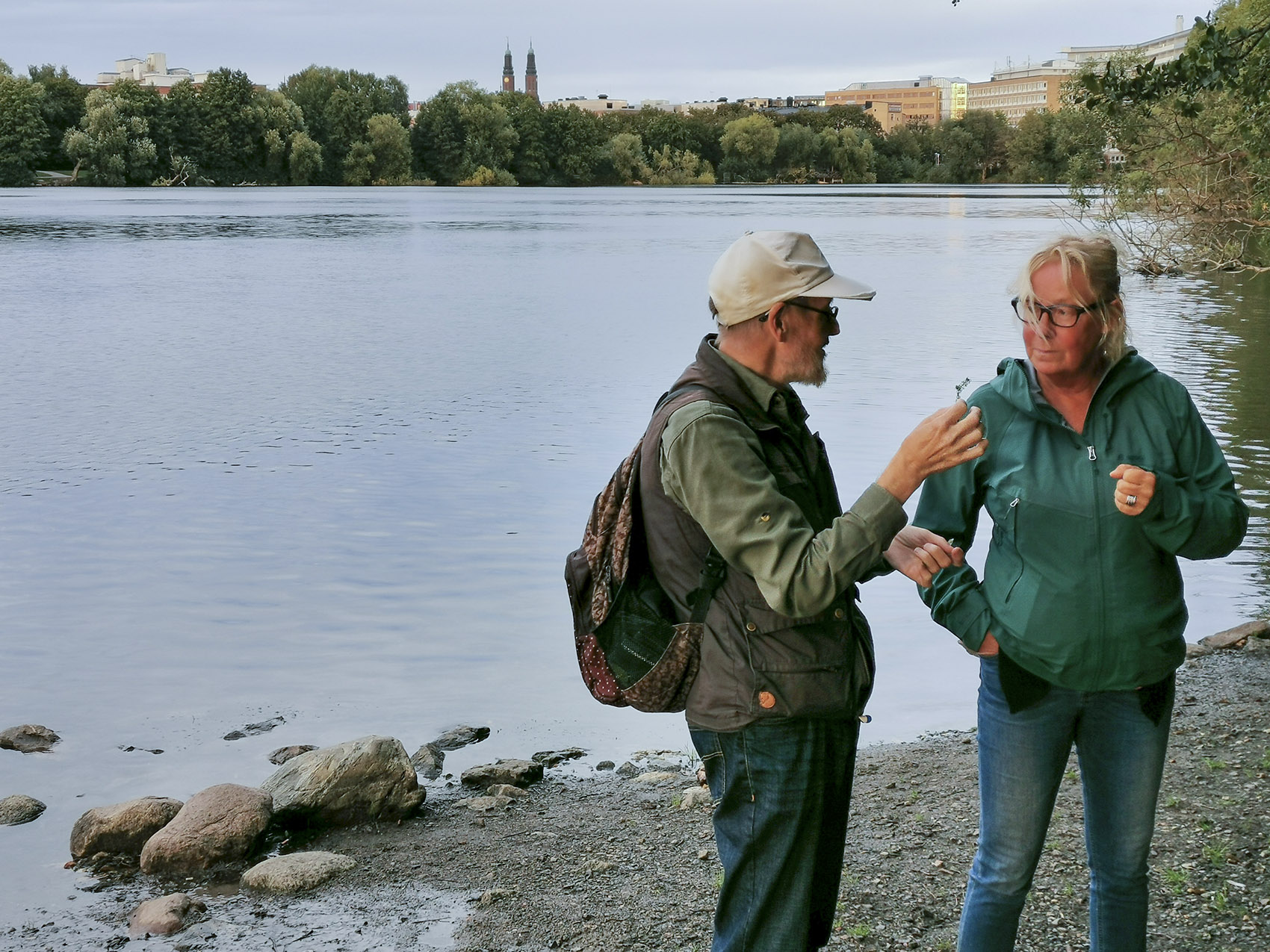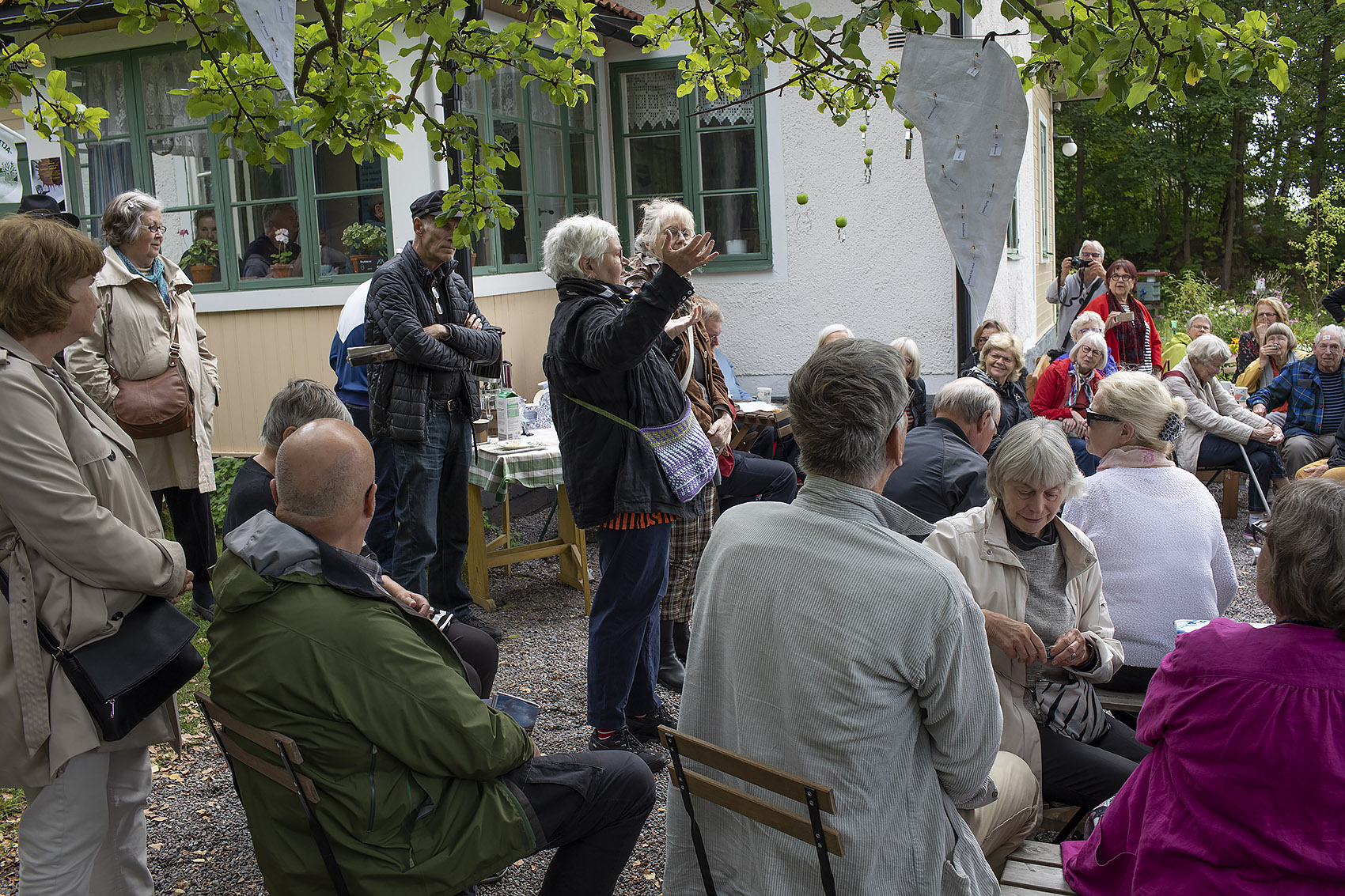 Men gräshopporna gör ingen skada, inte i vår del av världen, och inte heller våra grannar bålgetingarna. Men ifjol byggde de i timmerväggen, vi hörde dem inifrån rummet hur de jobbade och när hösten kom och boet redan övergivits blev det fuktfläckar på den tunna innerväggen. När nu masoniten revs blottades det magnifika boet. I år har de byggt längre bort från huset och vi har knappt sett till dem förrän nu, i de mörka kvällarna samlas de kring ytterlamporna – till skillnad från vanliga getingar är de tydligen aktiva även på natten – och på dagarna sitter de i trädgården och äter av äpplena. (2019-08-31)