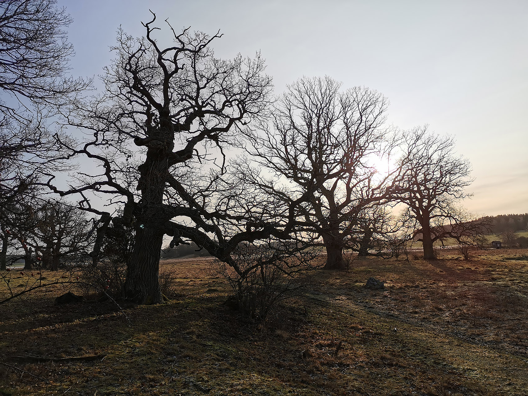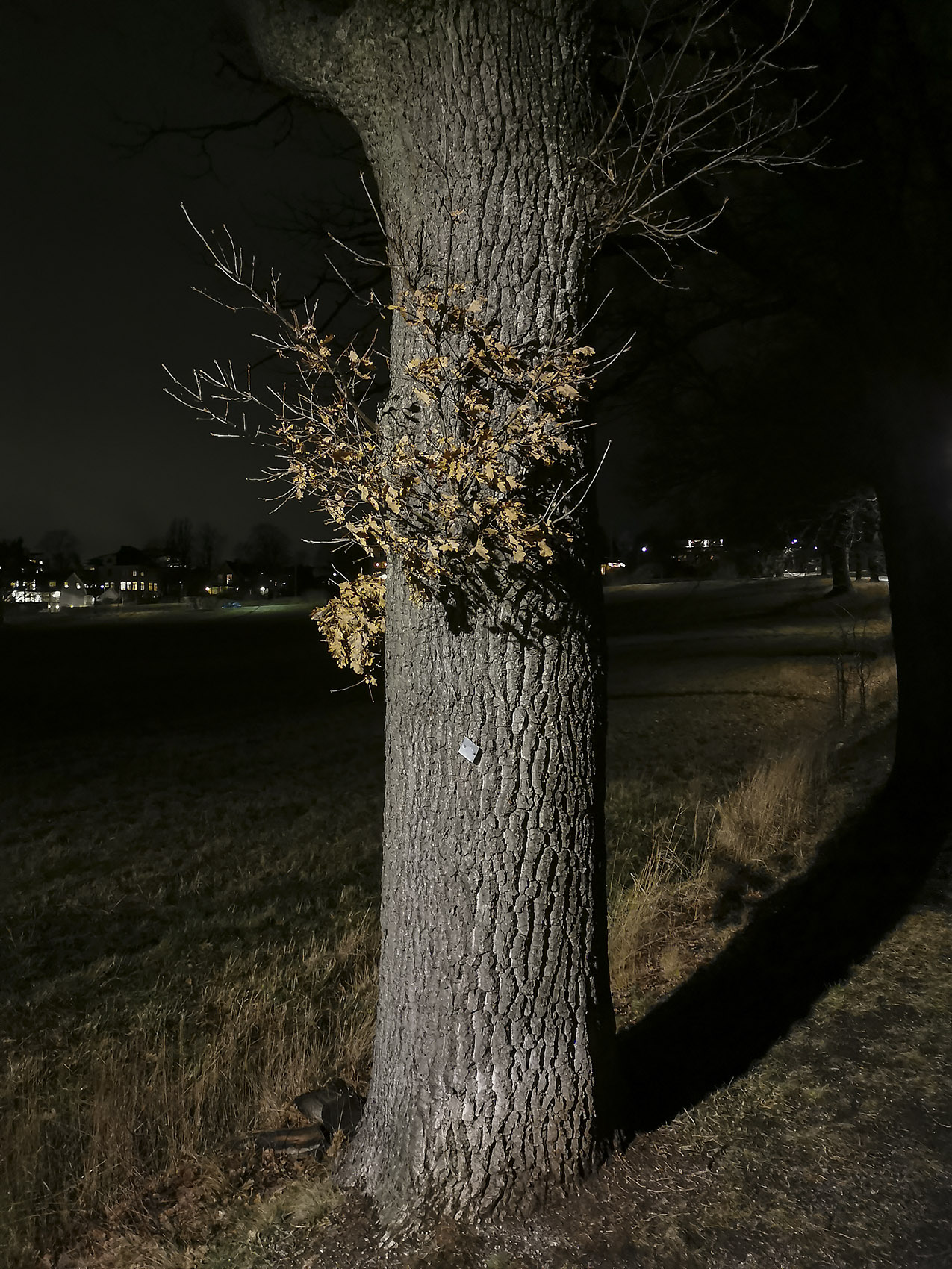 Hem går jag en annan väg, jag tvärar över det Lilla kärret till den punkt där KilGustav står på pass på den fina bild som pappa tog den 9 oktober 1967. Bakom honom började stigen genom skogen ner till Sandängskärret. Nu går jag samma väg, med hjälp av Fastighetskartan och mobilen, och letar mig fram i kanten på det nyupptagna kalhygget; någon stig finns det inte numera. Men jag når fram till målet och noterar med glädje att Stora granen står kvar, den har trotsat stormarna, men börjar se litet maläten ut. Den var ett säkert riktmärke när man skulle gå stigen åt andra hållet, och ett bra rådjurspass, om jag minns rätt. Det får bli en selfie med granen som bakgrund, så som det anstår den moderna tidens berättare! (2020-01-15)