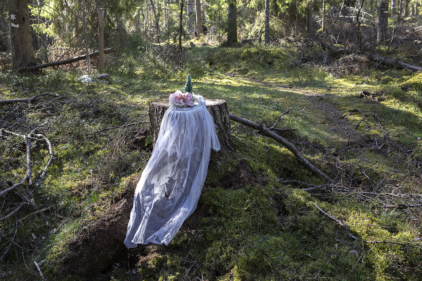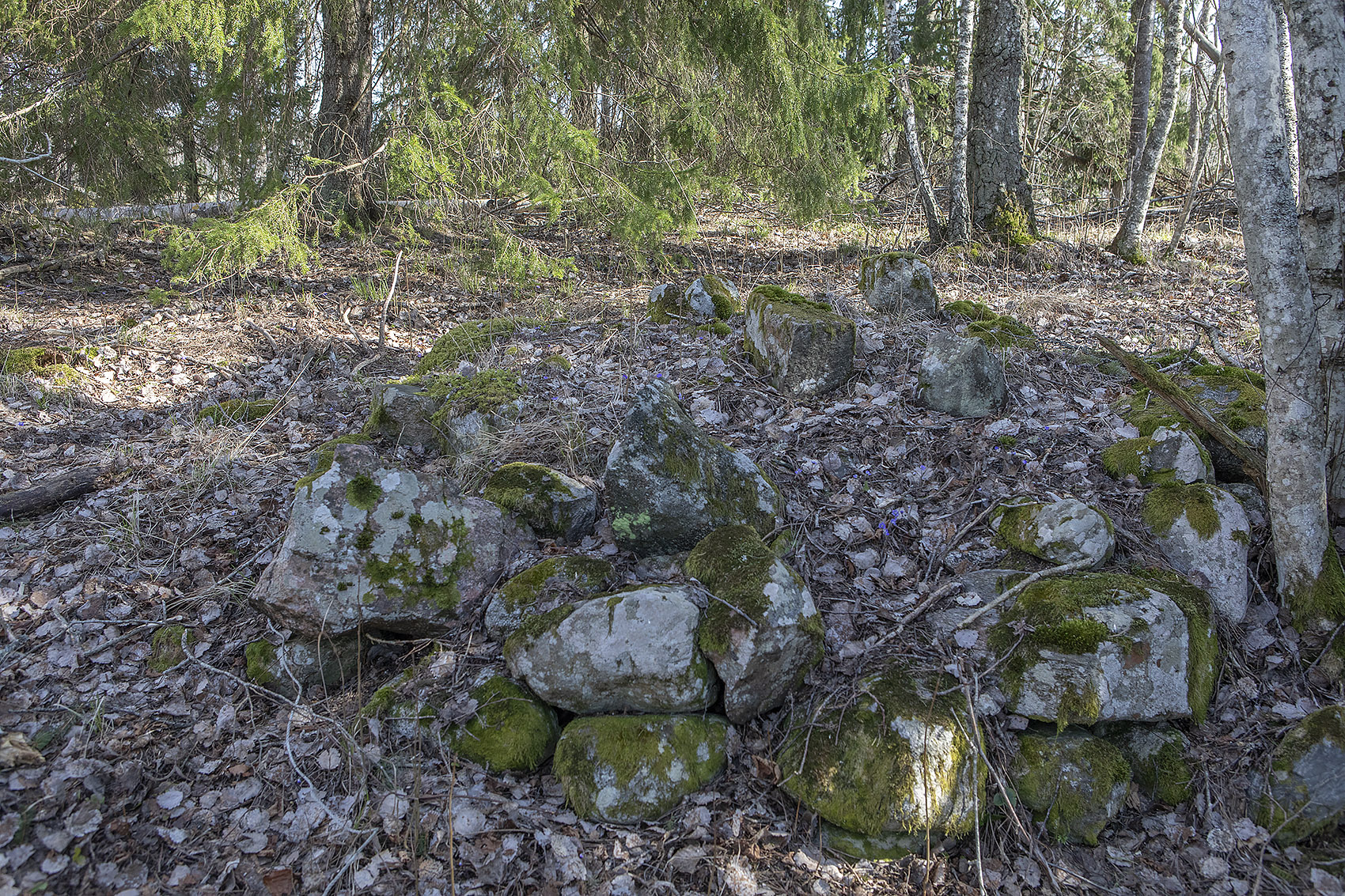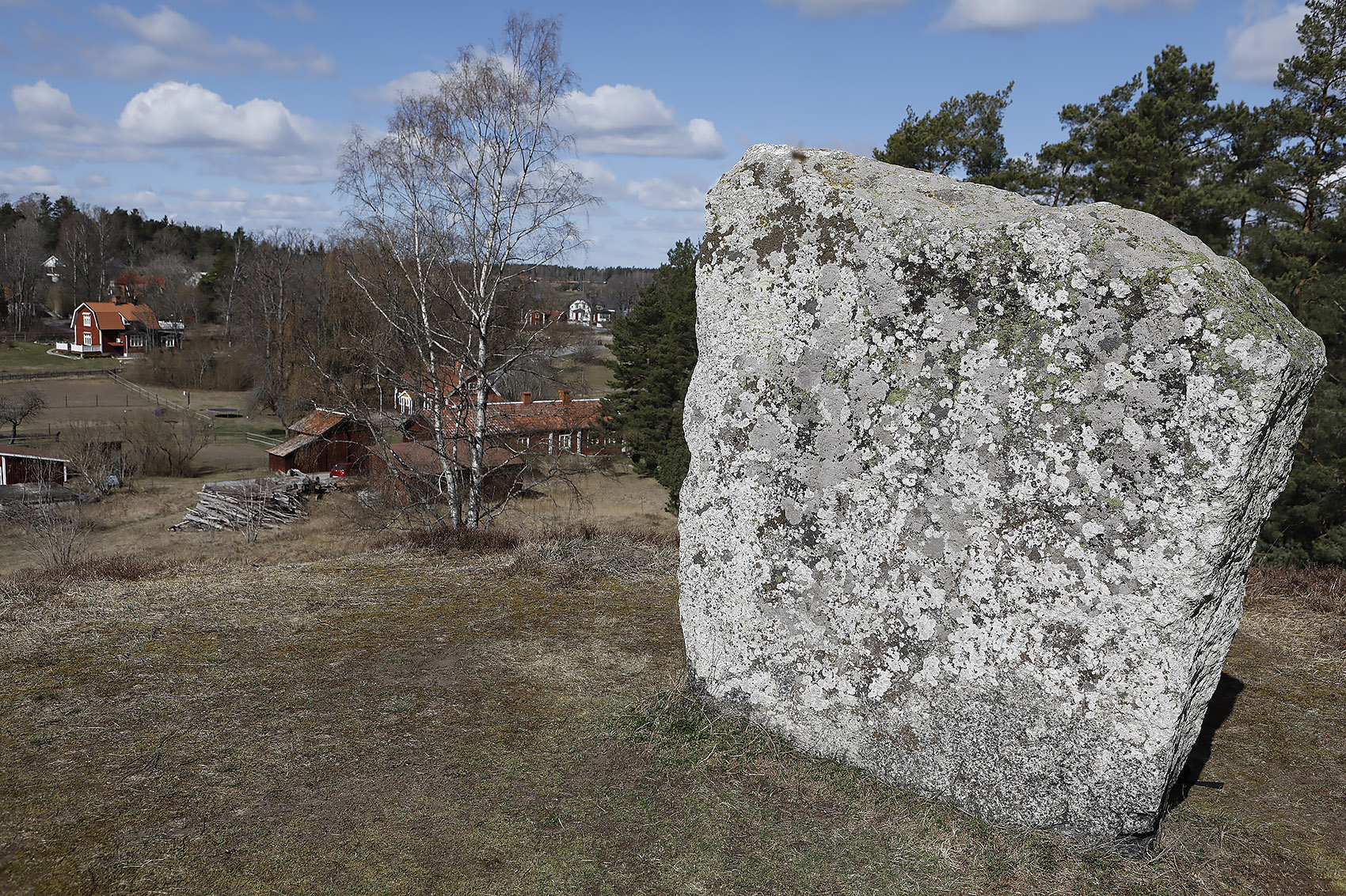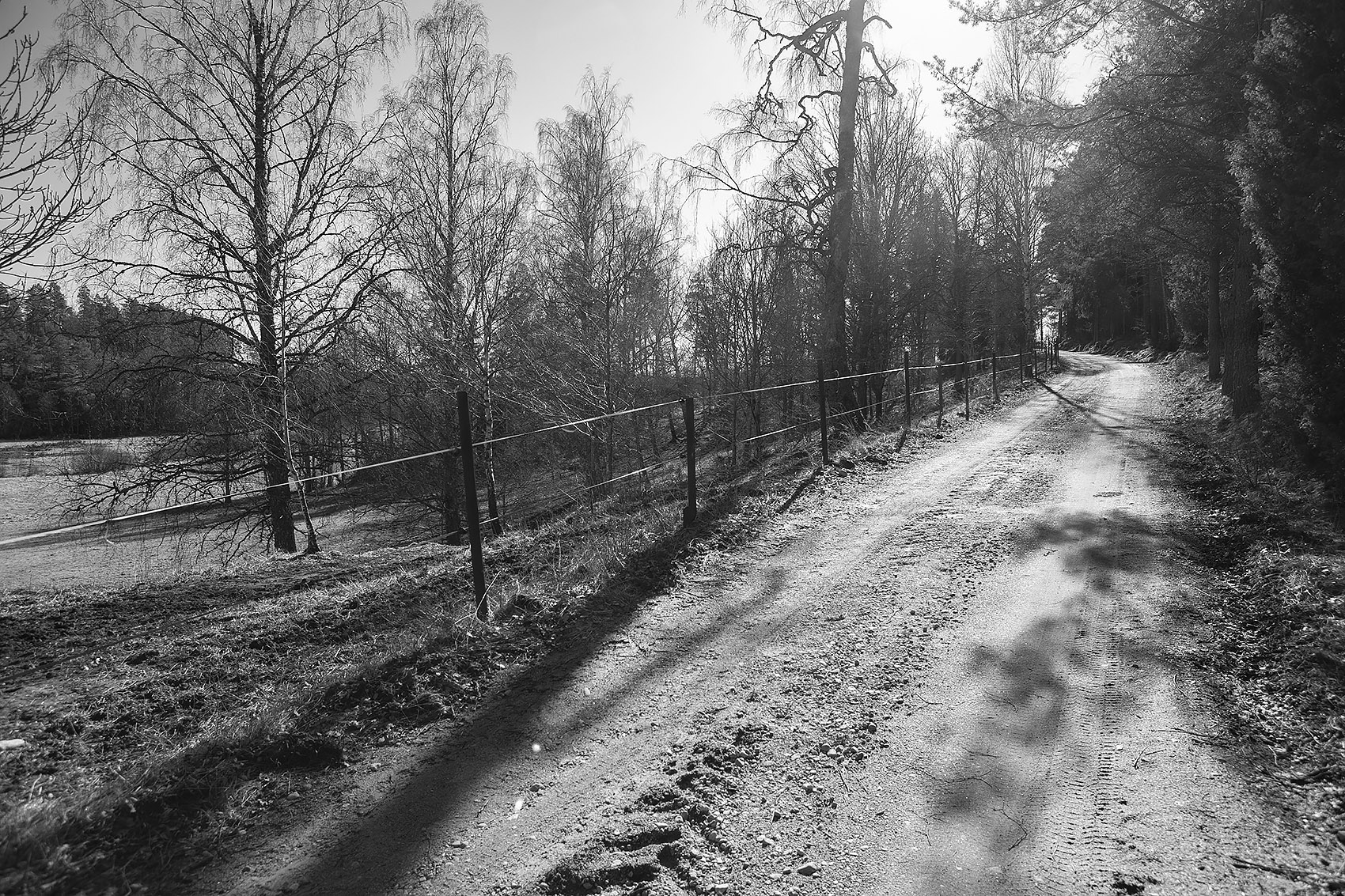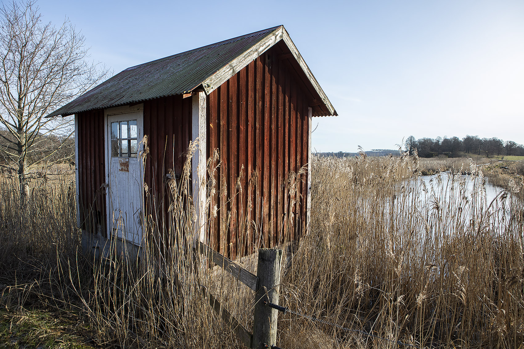 Nu går jag till sjön västerifrån, upptäcker ännu en råsten, Nr 1A, bevarad ända sedan Skiftets tid, den bör alltså vara åtminstone drygt 150 år gammal, fortsätter på den skitiga och sönderkörda vägen ner till Långa kärret, där Erland brukade sitta, och följer sedan stigen runt sjön. I den högstammiga granskogen på östra sidan satt vi också och passade på älg, jag letar förgäves efter en bild som jag tog där 1974, på morfars jacka, som han hade lagt ifrån sig när vi satte upp en koja inför jakten. Istället blir det en suddig bild av kojruinen som den såg ut när Robert och jag gick förbi där inför älgjakten 16 år senare, den 29 september 1991. Nu har många av de resliga träden blåst sönder och ligger i brötar, Alfrida gjorde ett grundligt jobb i Roslagsskogarna, men jag lyckas ta mig förbi dem, på insidan, mot sjön. Här är naturreservat så träden får antagligen ligga kvar och jag vet inte om det är så bra; på andra sidan sjön har det tagits upp ett stort kalhygge efter stormen. Jag tar mig över utfallsdiket, sjön måste vara sänkt men konstigt nog finns det inga anteckningar och inga minnen om den saken i byn trots att den är samfälld och ingår i byns vatten. Kanske därför att den är så liten och här fanns inga kvarnar eller sågar eller andra rättigheter att ta hänsyn till, och dessutom låg och ligger hela sjön på en fastighets mark. Kanske grävde bonden som fick det här skiftet, Litt O, diket och vann de två åkerlapparna på västra sidan, enligt kartorna är de uppodlade efter skiftet. Nu när ingen brukar dem längre och dikena slammar igen återgår de till kärr. Men den timrade sjöboden står kvar, nymålad och fin, mest som ett minne, det är nog ingen från vår by som längre går hit och fiskar.