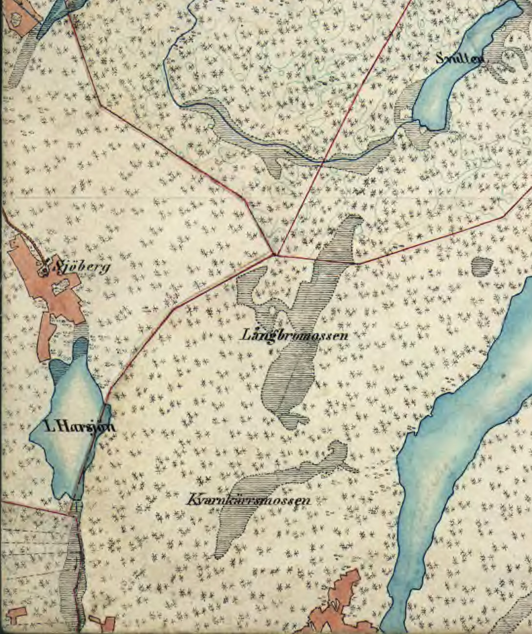 Utsnitt ur Häradsekonomiska kartan (Rialadelen) över Sjöberg. "Kvarnkärrsmossen" sydost om L Harsjön ingår idag i "Bromseby naturreservat" (som även omfattar den vackra hällmarken öster om kärret.