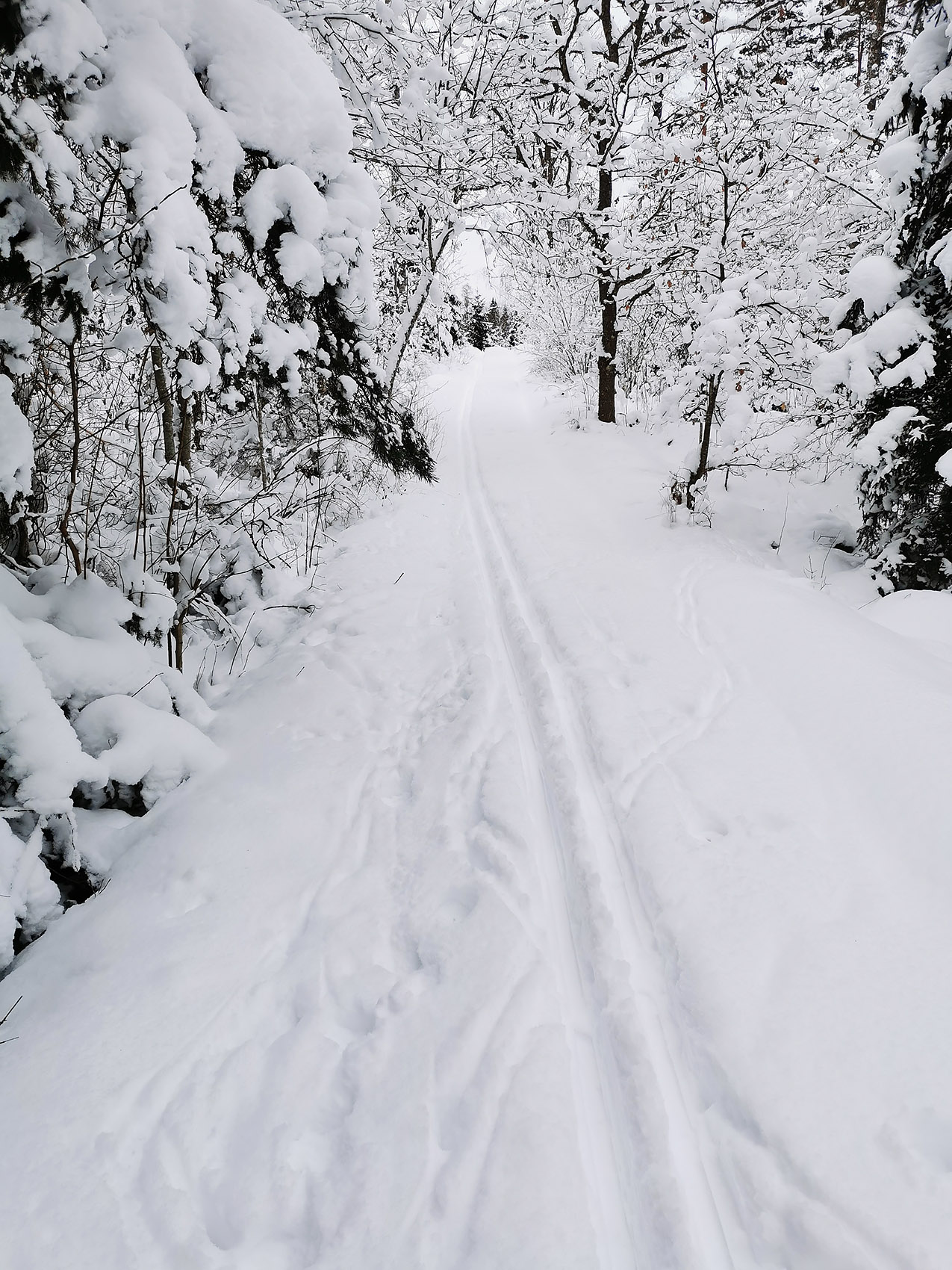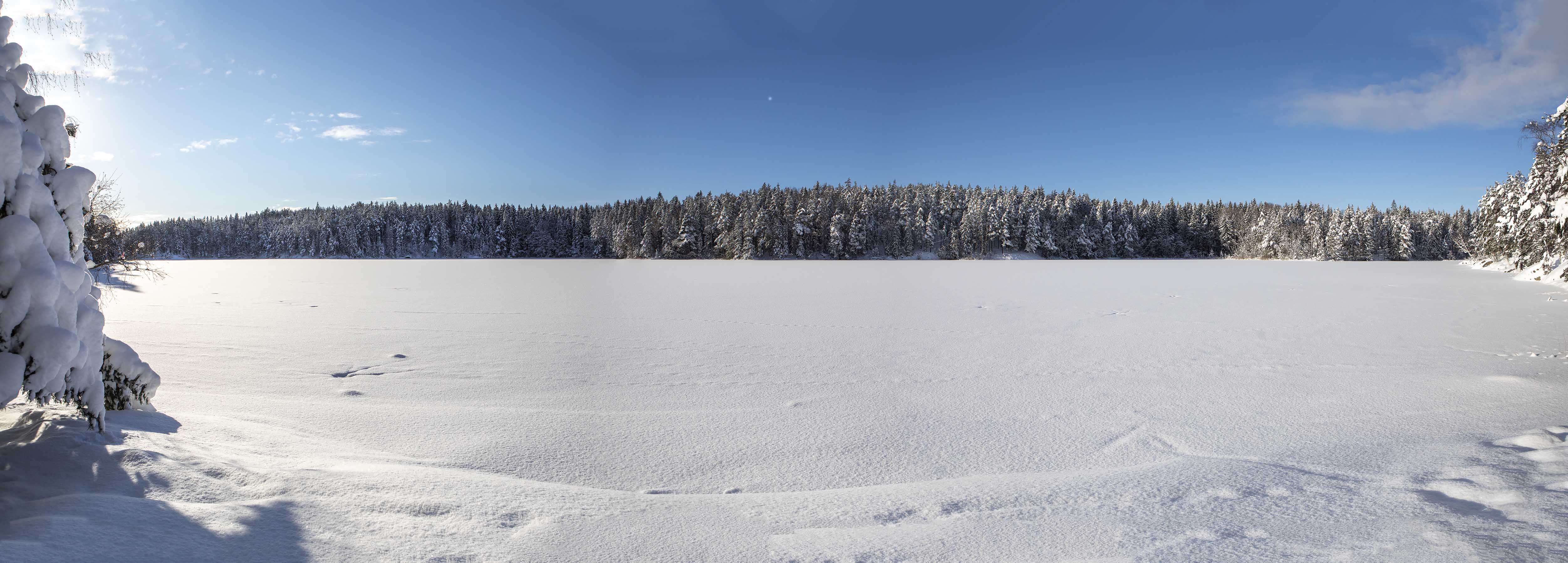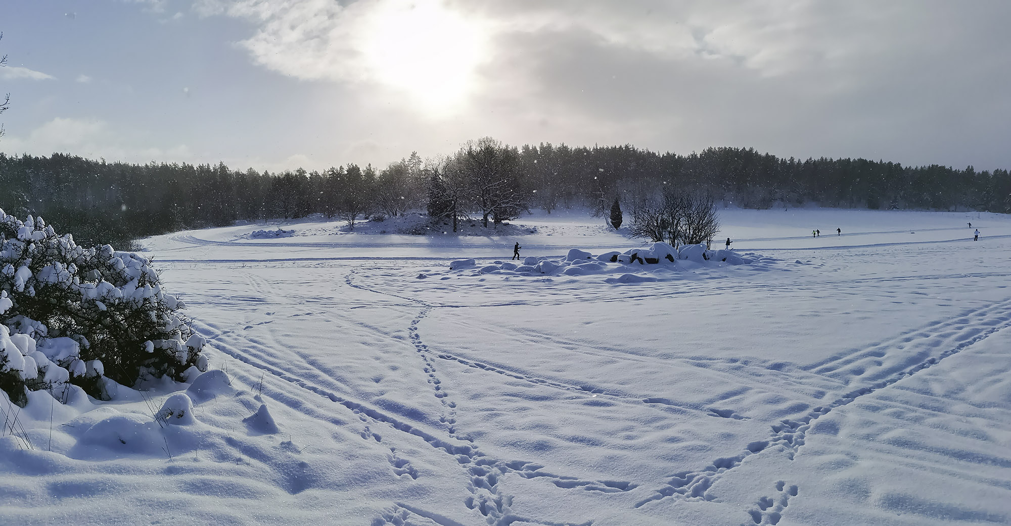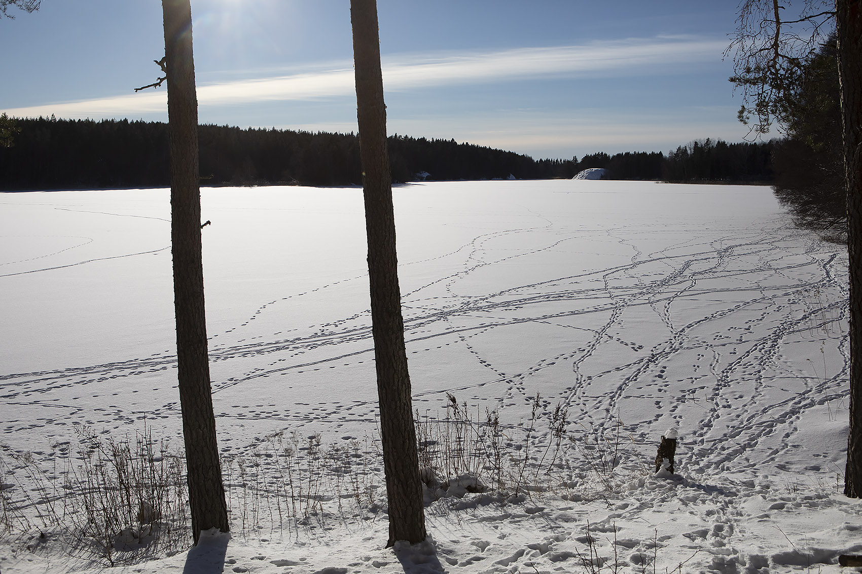 Solen sken över snön, och mot oss, hela dagen. Uppe på skogen hade grisarna korsat vägen, på flera ställen. Och en låg död i ett dike, troligen ihjälkörd, en smitningsolycka. Två älgar håller till längst upp mot grannbyns marker och en nere vid landsvägen. Rådjur och åter rådjur, de är där det bjuds mat, alldeles nertrampat kring saltstenen och utfordringen inne på Sigfrids. Mård på tre ställen, de håller alltså ställningarna, den som förr i tiden var så ovanlig i de här skogarna. Vi skrämde upp en sork, eller näbbmus? på vägen. Jäklar vad bråttom den fick att krypa ner i snön igen! En talltita varnade uppe vid Grytahygget, en korp hördes, talgoxe, blåmes och nötväcka; annars tyst. Så tyst som det bara kan bli en vindstilla dag i en snötäckt skog, långt borta från staden och de stora vägarna. (2021-02-15)
