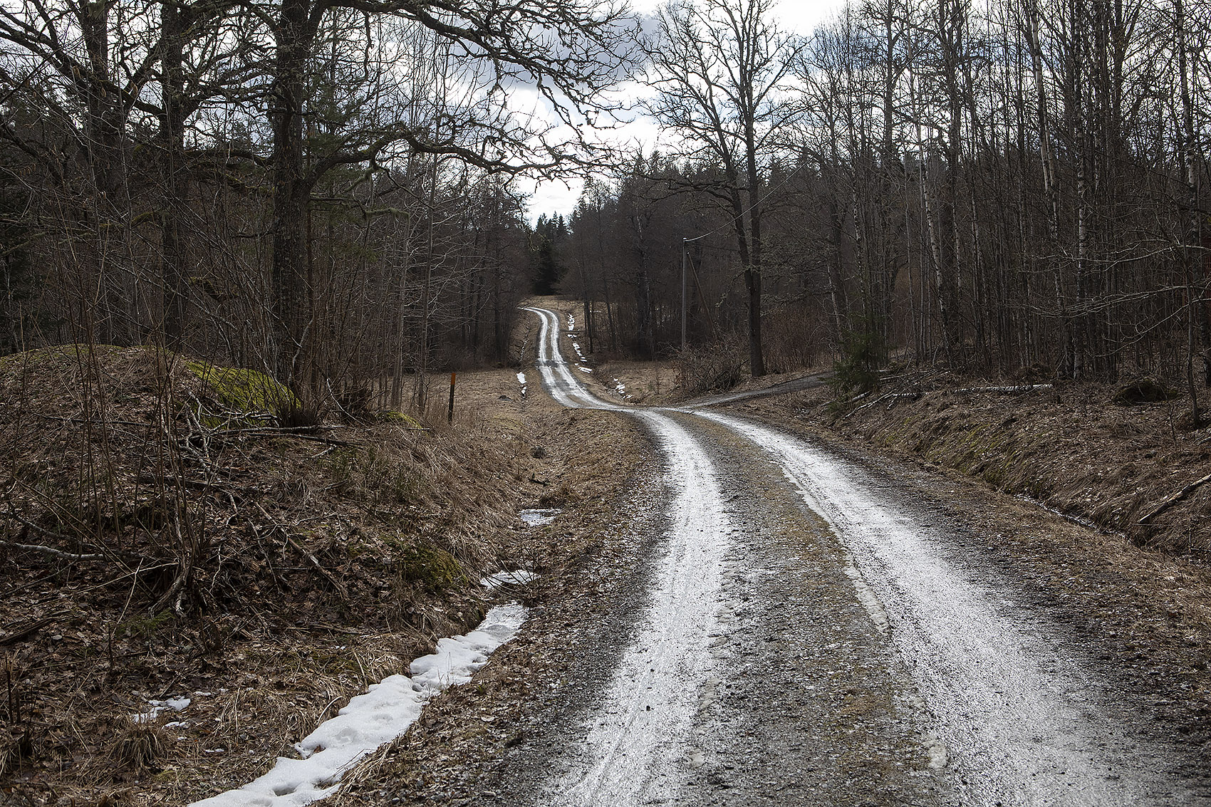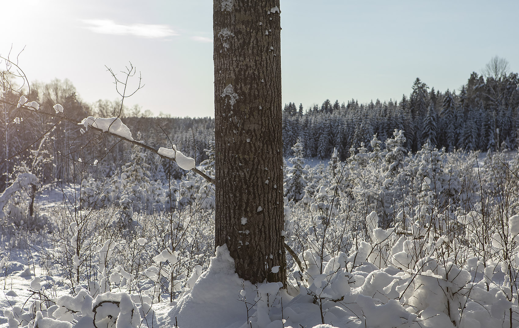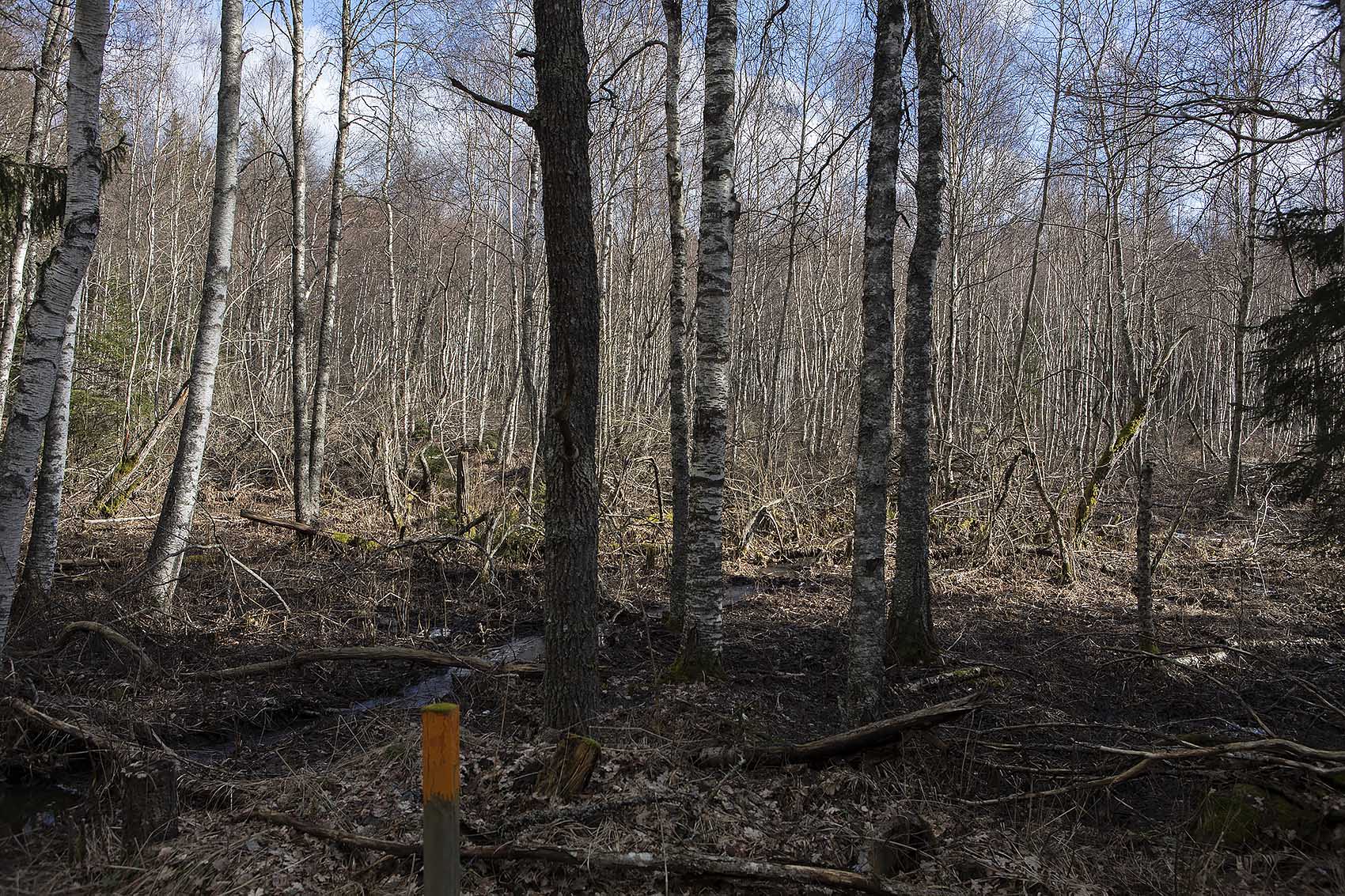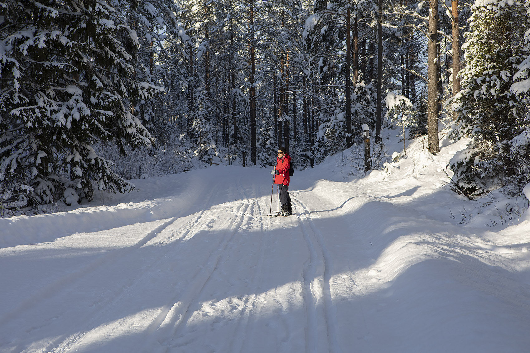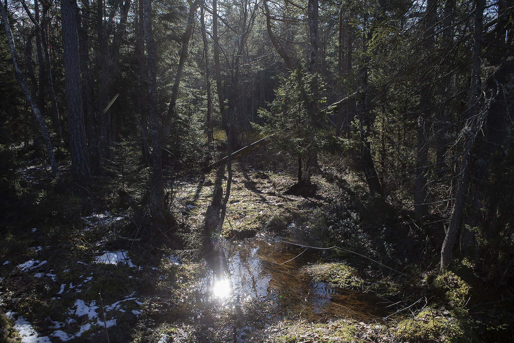Solen sken över snön, och mot oss, hela dagen. Uppe på skogen hade grisarna korsat vägen, på flera ställen. Och en låg död i ett dike, troligen ihjälkörd, en smitningsolycka. Två älgar håller till längst upp mot grannbyns marker och en nere vid landsvägen. Rådjur och åter rådjur, de är där det bjuds mat, alldeles nertrampat kring saltstenen och utfordringen inne på Sigfrids. Mård på tre ställen, de håller alltså ställningarna, den som förr i tiden var så ovanlig i de här skogarna. Vi skrämde upp en sork, eller näbbmus? på vägen. Jäklar vad bråttom den fick att krypa ner i snön igen! En talltita varnade uppe vid Grytahygget, en korp hördes, talgoxe, blåmes och nötväcka; annars tyst. Så tyst som det bara kan bli en vindstilla dag i en snötäckt skog, långt borta från staden och de stora vägarna. (2021-02-15)