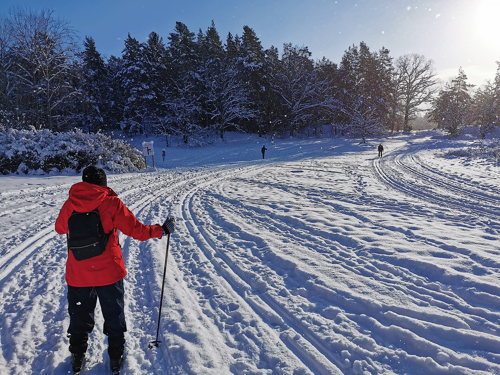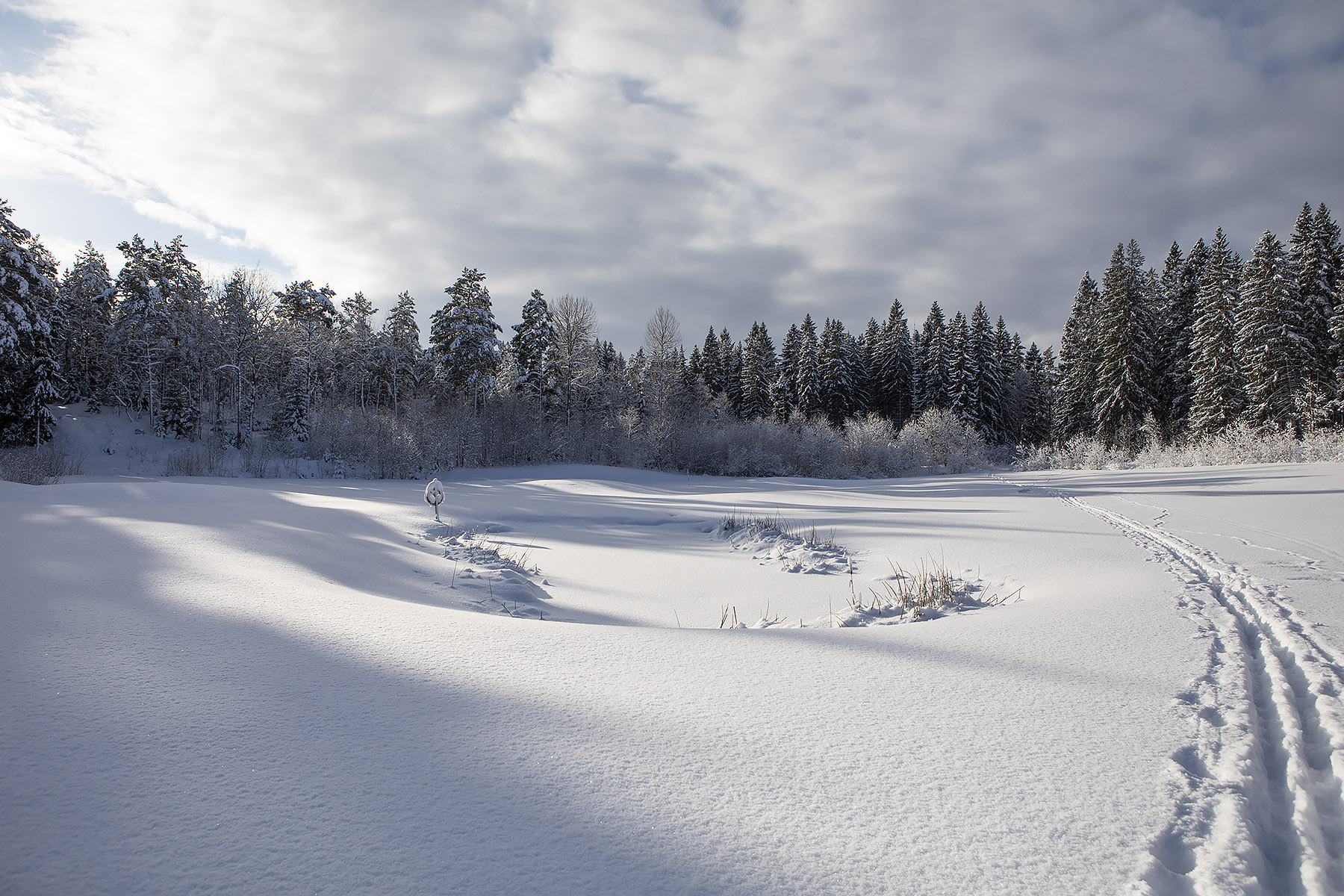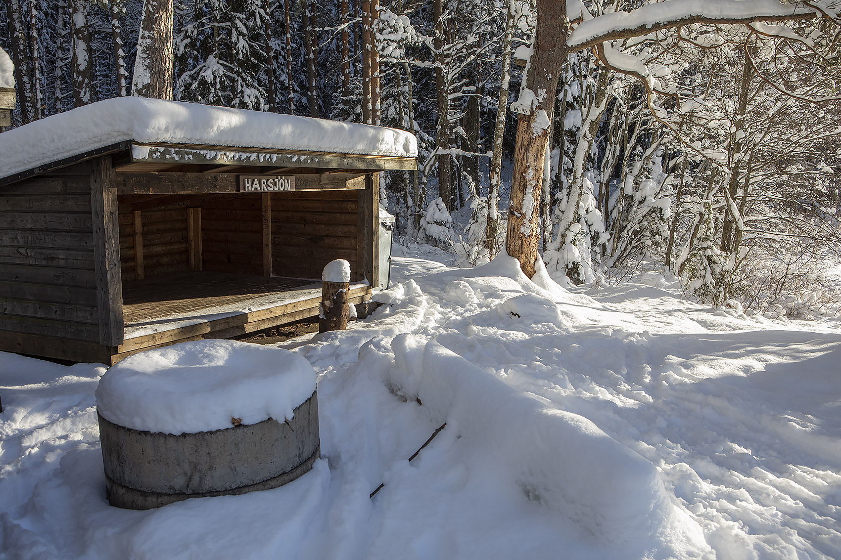 Dagens skidtur startade återigen vid Brollsta golfklubb. Det är många som åker skidor på den banan, men de flesta väljer antingen den mellersta delen där det som regel finns spår som andra har dragit upp eller också den västra delen, mot gamla Norrtäljevägen, där någon (idrottsföreningen?) gör fina spår med maskin. Vi hade litet andra planer idag så vi valde att åka upp mot den mindre östra delen av banan och tvärade över den fram till Sätermossen. Hit fick vi spåra själva, tungt, åtminstone tre decimeter lössnö. Sedan åkte vi på den nyligen plogade vägen som går i nord-sydlig riktning mellan Vrangen och Harsbro. Vi åkte inte till vägs ände utan vände vid L:a Harsjön och pausade vid Roslagsledens fina rastplats på östra sidan av sjön. Idag var vi ensamma här, på sommaren är det många som går hit och badar. På tillbakavägen mötte vi ett ungt par som tänkte övernatta vid sjön. Det är mest plantageskog längs vägen utom högst upp på hällmarkerna. Den enda fågelobsen idag var tofsmes. Det verkar som att det är den av skogsmesarna (talltita, svartmes och tofsmes) som klarar de nya skogarna bäst, i alla fall är det den som vi oftast ser och hör i de här markerna. Korpen brukar alltid höras, men inte idag, och inga skogsfågelspår heller. Rådjur är det vanligaste viltspåret, i synnerhet i anslutning till golfbanan. Inte en enda älg syntes till och inte heller någon gris. Undrar hur det är med mården, brukar oftast se åtminstone något spår över skogsbilvägen under en sådan här tur, men inte idag. Däremot ekorre på flera platser. Och någon räv förstås.