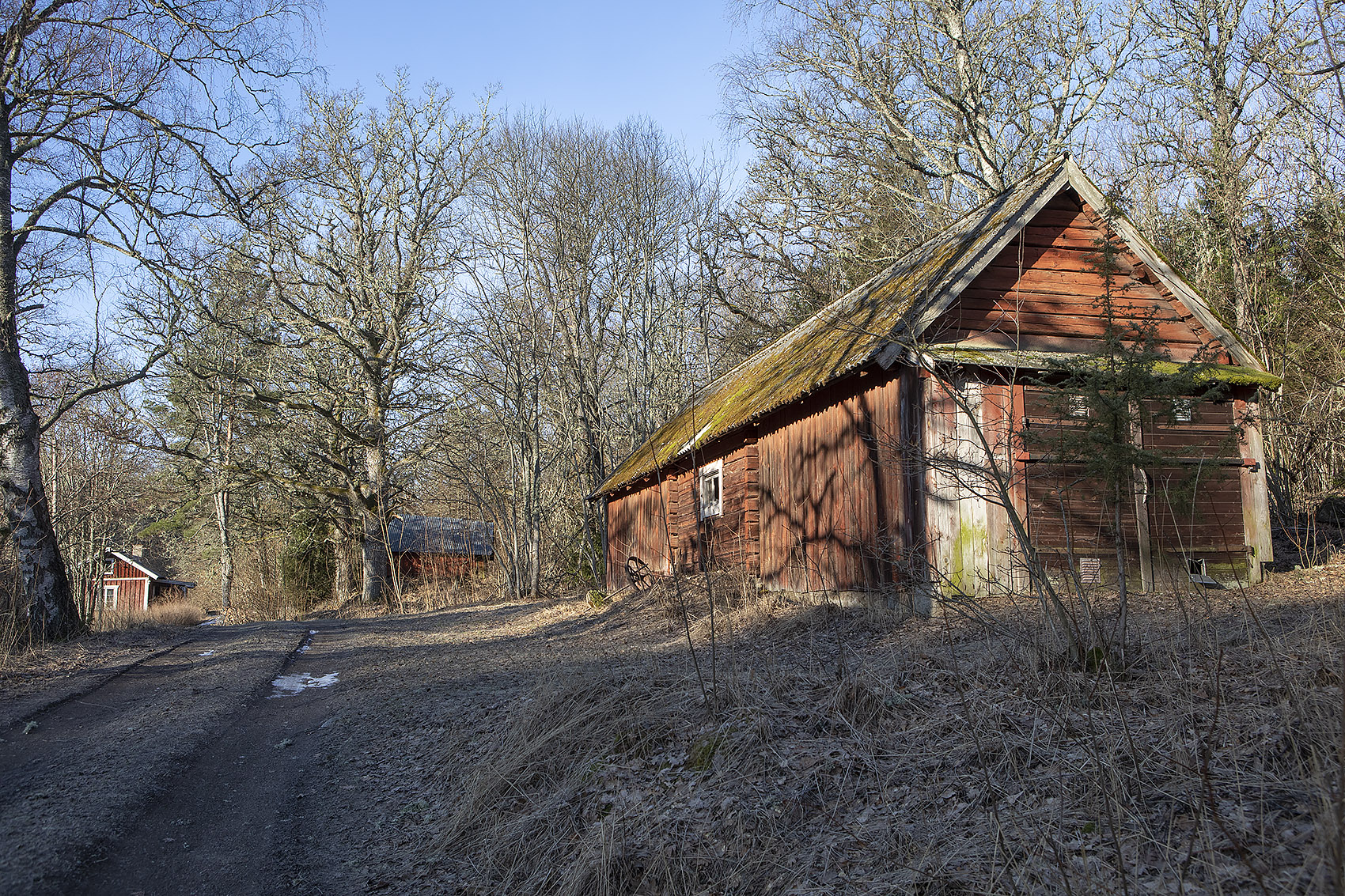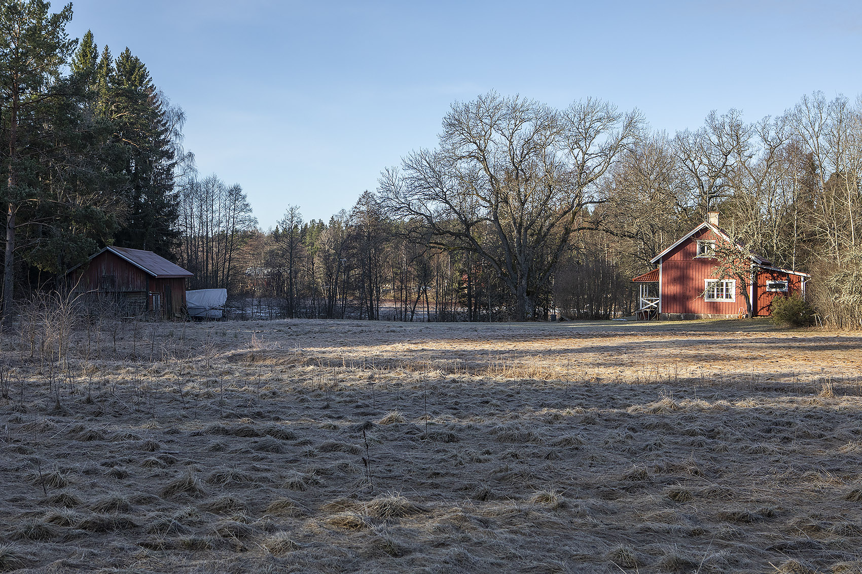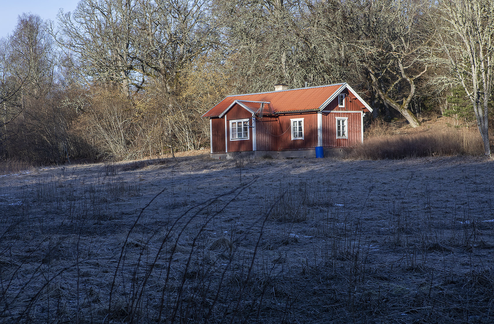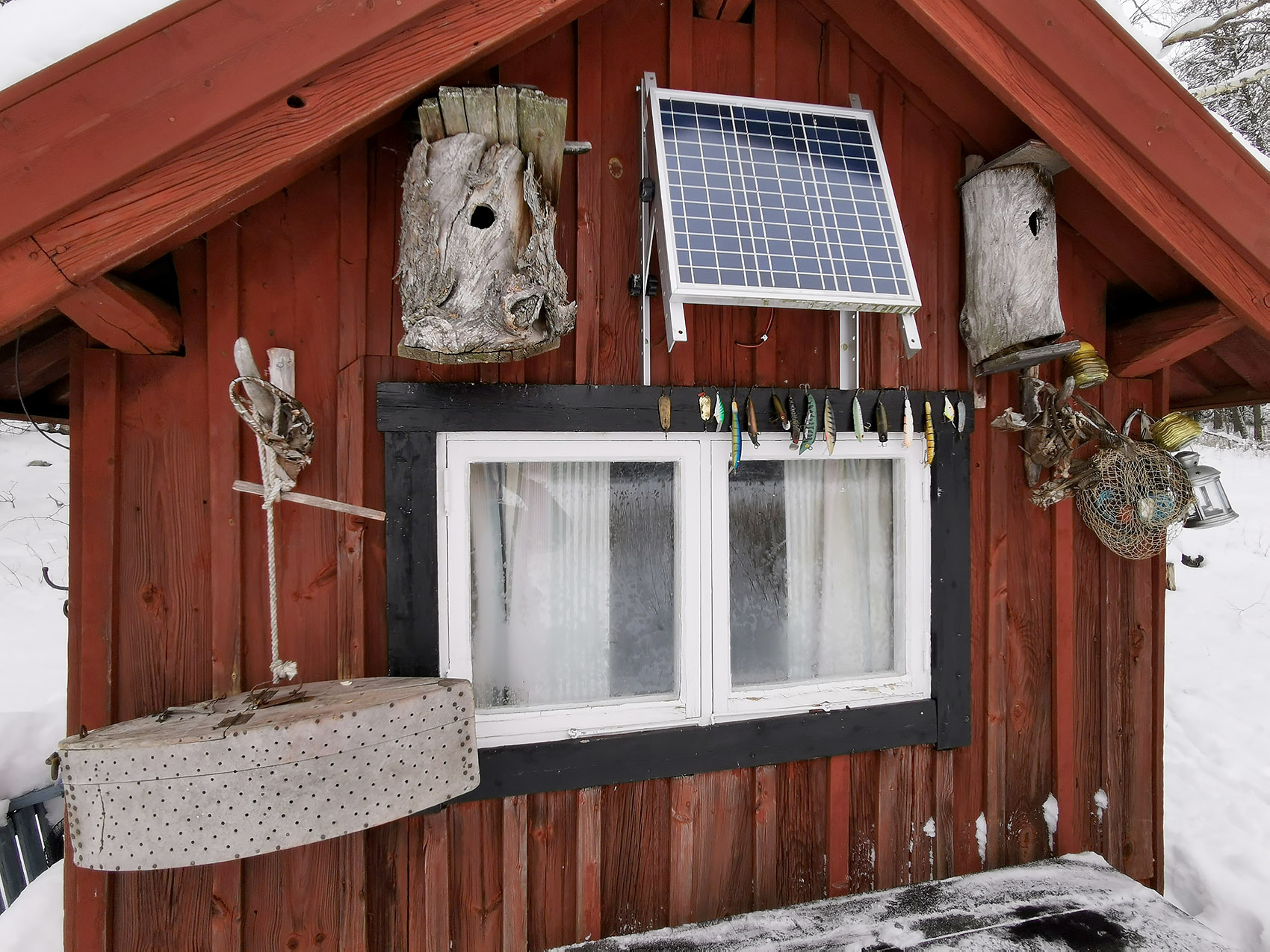Favorit i repris: Det lilla huset med de vackra holkarna, en sump och många drag. Ursprungligen Eremitkojans tvättstuga. När den sista arrendatorn lämnat det stället i slutet på 50-talet drogs stugan på isen över till granngården där den blev till bastu. (201-02-12)