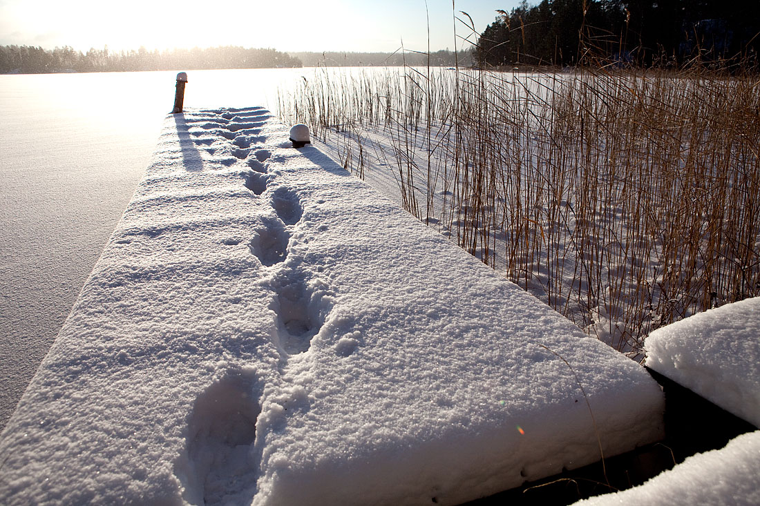 För två år sedan såg det ut så här på det nya året: glansis på insjön. I år är det än så länge en halv meter snö och stöp på isen -- varken skridsko- eller skidföre!