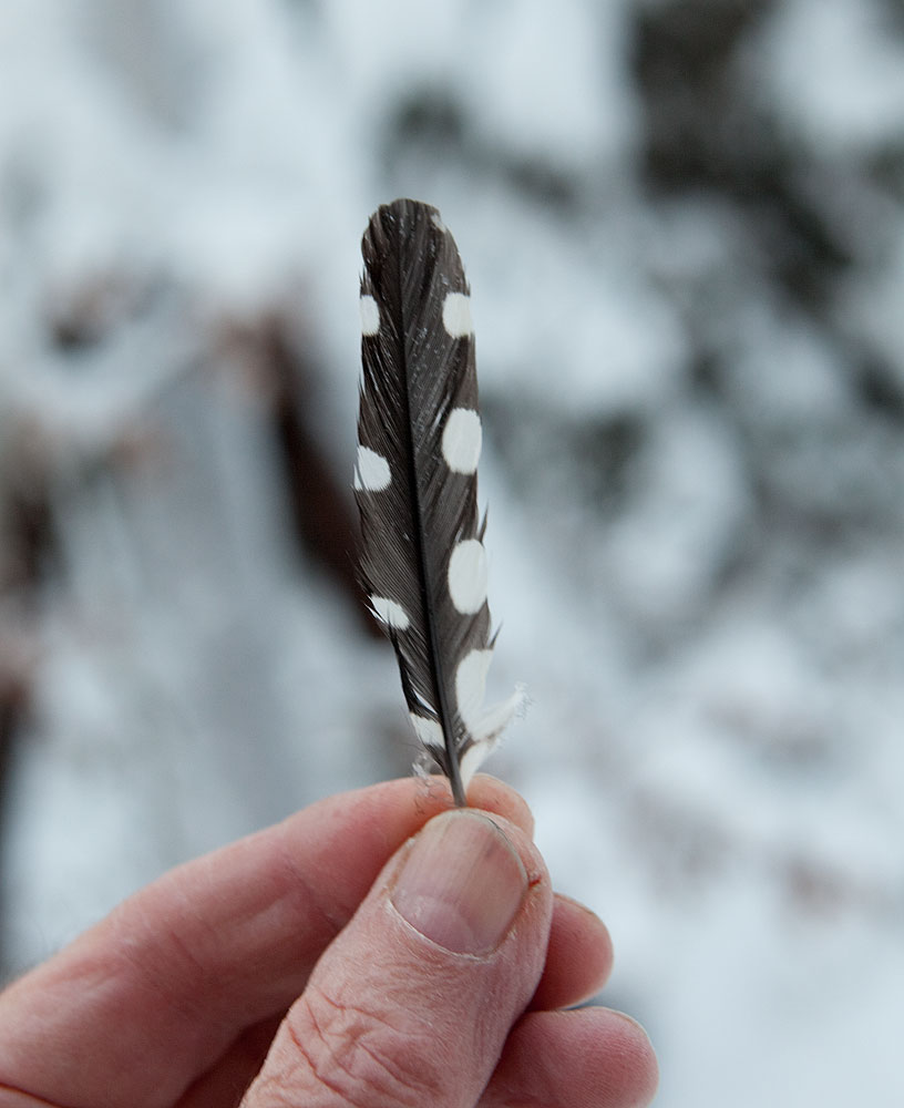 ...i vägkanten hade ett blodigt drama utspelat sig. Inga spår på marken till eller från brottsplatsen. En hök eller uggla hade ätit upp en fågel med gråsvarta vingpennor med stora vita fläckar ...