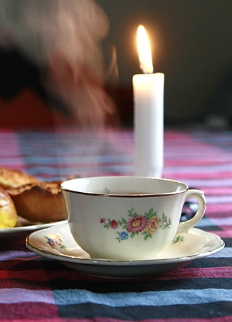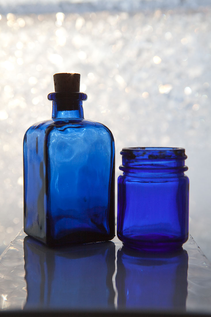 Väl framme vid torpet var det bara -6 grader inomhus, trots att huset stått oeldat. Timmerhusen är fantastiska! De blå flaskorna lyste så vackert mot de rimfrostiga fönstren.