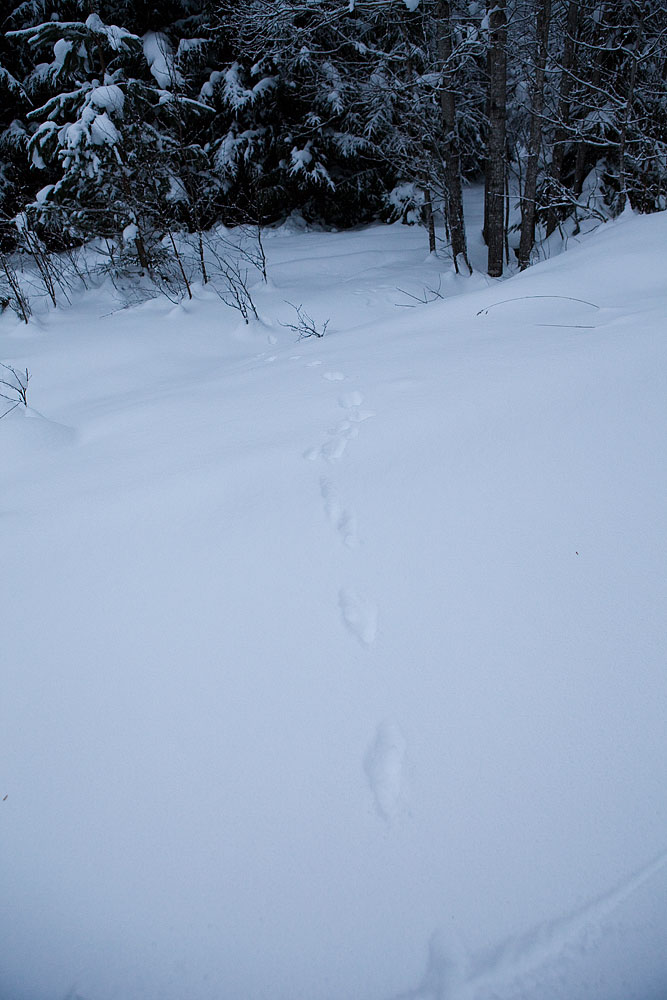 Vargarna höll till i området, men idag såg vi inga spår efter dem. De lär ha varit vid Storsjön häromdagen. Inte heller några lodjursspår idag. Däremot gott om mård i vinter, mer än de senaste åren. Spår kors och tvärs över vägen ända från bommen och ner till torpet. Troligen minst tre olika exemplar på dessa tre kilometer. Tyvärr också grisspår - en stor rackare hade bökat undan snön och förstört grässvålen i min slåtteräng.