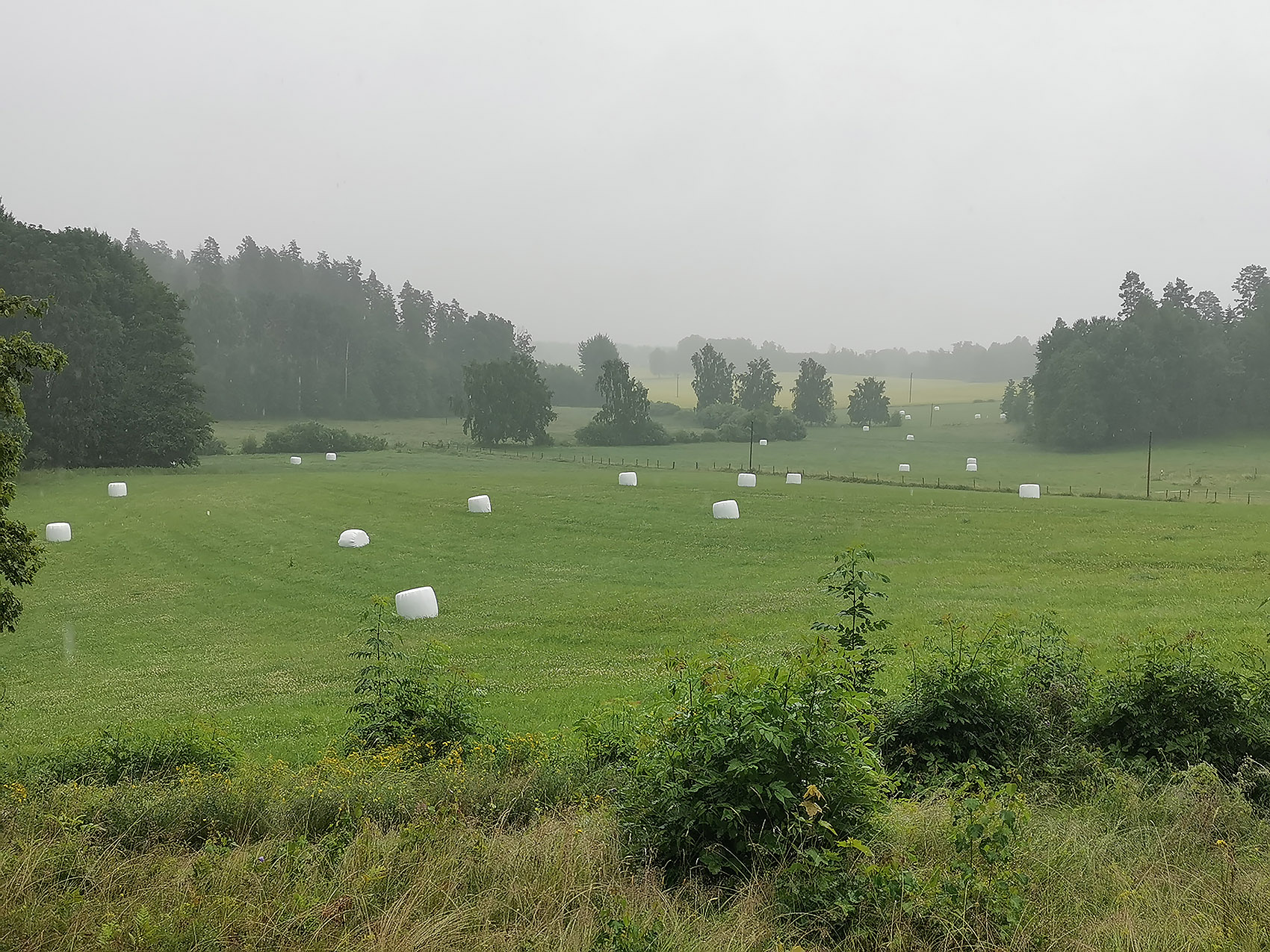 Så långt går jag inte idag, men jag rundar Fräkensjön och skrämmer upp två tranor på det stora hygget väster om sjön. Inte heller här någon trädlärka, bara gärdsmyg inne bland de många nya vindfällena i södra kanten av hygget. Till och med Stora granen verkar ha fått ge sig efter alla år som landmärke. Jag passerar Sandängskärret, också den övergiven åker, med en grismatning längst in. Förr gick en väg eller stig härifrån genom Johans kokärr ner till landsvägen. Kokärret övergavs tidigt med de gamla åkrarnas diken syntes ännu när vi gick här under jakten på 60- och 70-talen. Jag hittar inte tillbaka den här gången men ser efteråt att man med hjälp av fastighetskartan bör kunna göra det så det får bli ett nytt försök nästa gång. Här är en eländig slyskog och besvärligt att ta sig fram för en trött 75-åring och jag tänker på den jämnåriga kvinnan från tomtområdet i Gryta som gick vilse här förra året och aldrig kom tillbaka.