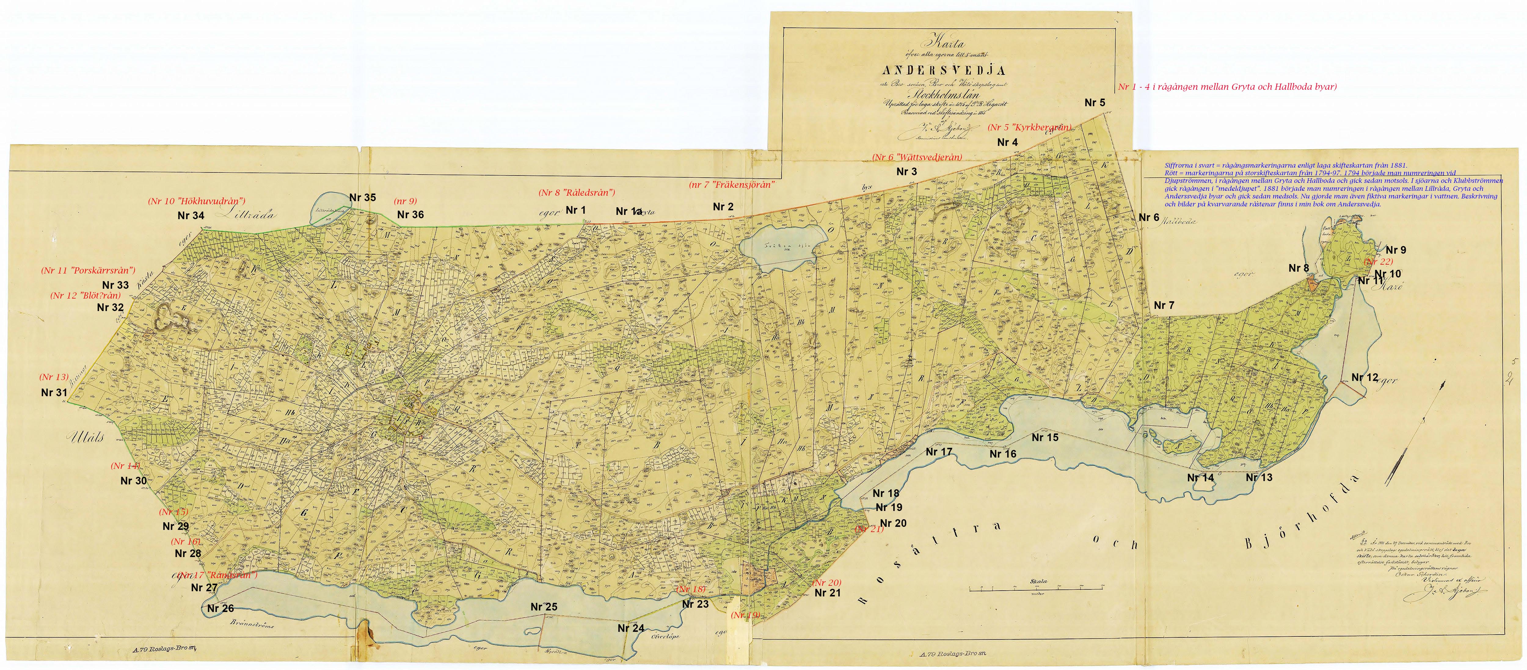 Jag har i min bok “Anderssvedja - en by i Roslagen” redogjort för de 36 rågångsmarkeringar som under laga skiftet beskrevs vid en syn den 27 oktober 1856. För några av råstenarna hade jag även med ännu äldre uppgifter. Det jag då inte hade uppmärksammat var att det på sista sidan i storskifteshandlingarna från 1794 finns en “Rågångs Beskrifning” över rågångsmarkeringarna gentemot omkringliggande byar. Vid nästa skifte, laga skiftet 1856 -81, började man numreringen där Anderssvedja, Lillråda och Gryta byar möts och gick sedan medsols. I storskifteshandlingarna gjorde man tvärtom och gick motsols. Dessutom började man räkna mera österut, från Djupströmmen i Sandängsfjärden. Det är anmärkningsvärt därför att på den samtida storskifteskartan över Hallboda by (fastställd 1801) framgår tydligt att Hallboda är en egen by och Anderssvedja börjar först där Hallboda, Anderssvedja och Gryta byar möts. Anderssvedja ansåg emellertid att Hallboda egentligen låg inom Anderssvedjas domäner och hänvisade bland annat till den äldsta kartan över Hallboda. Den är från 1640 och där heter det att “Hallboda ... belägit på Anderssvidia ägor”. Tvisten mellan byarna pågick ända in på 1800-talet och avgjordes till slut i en dom 1855 gällande fiskevattnen i Sandängsfjärden.