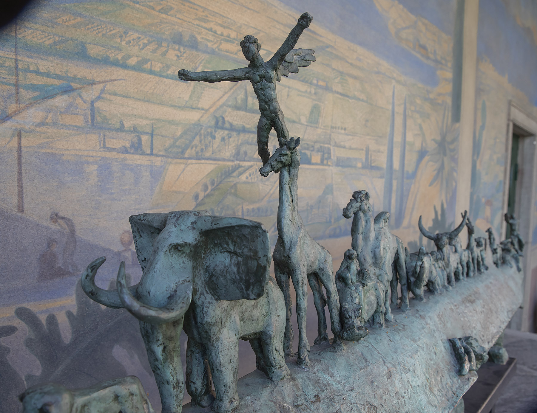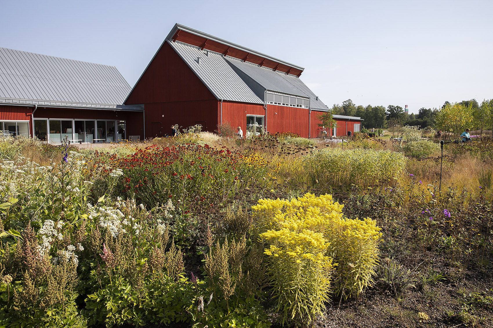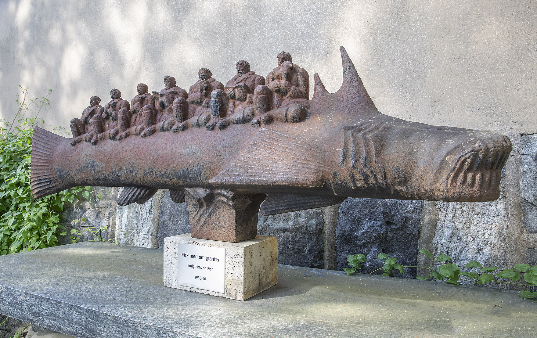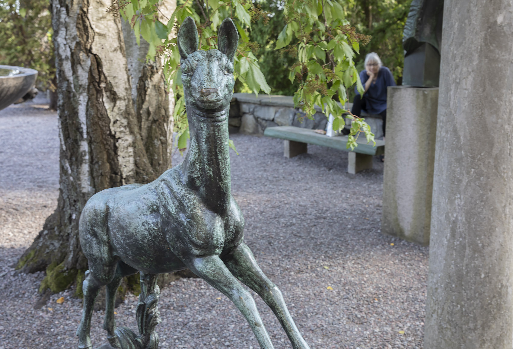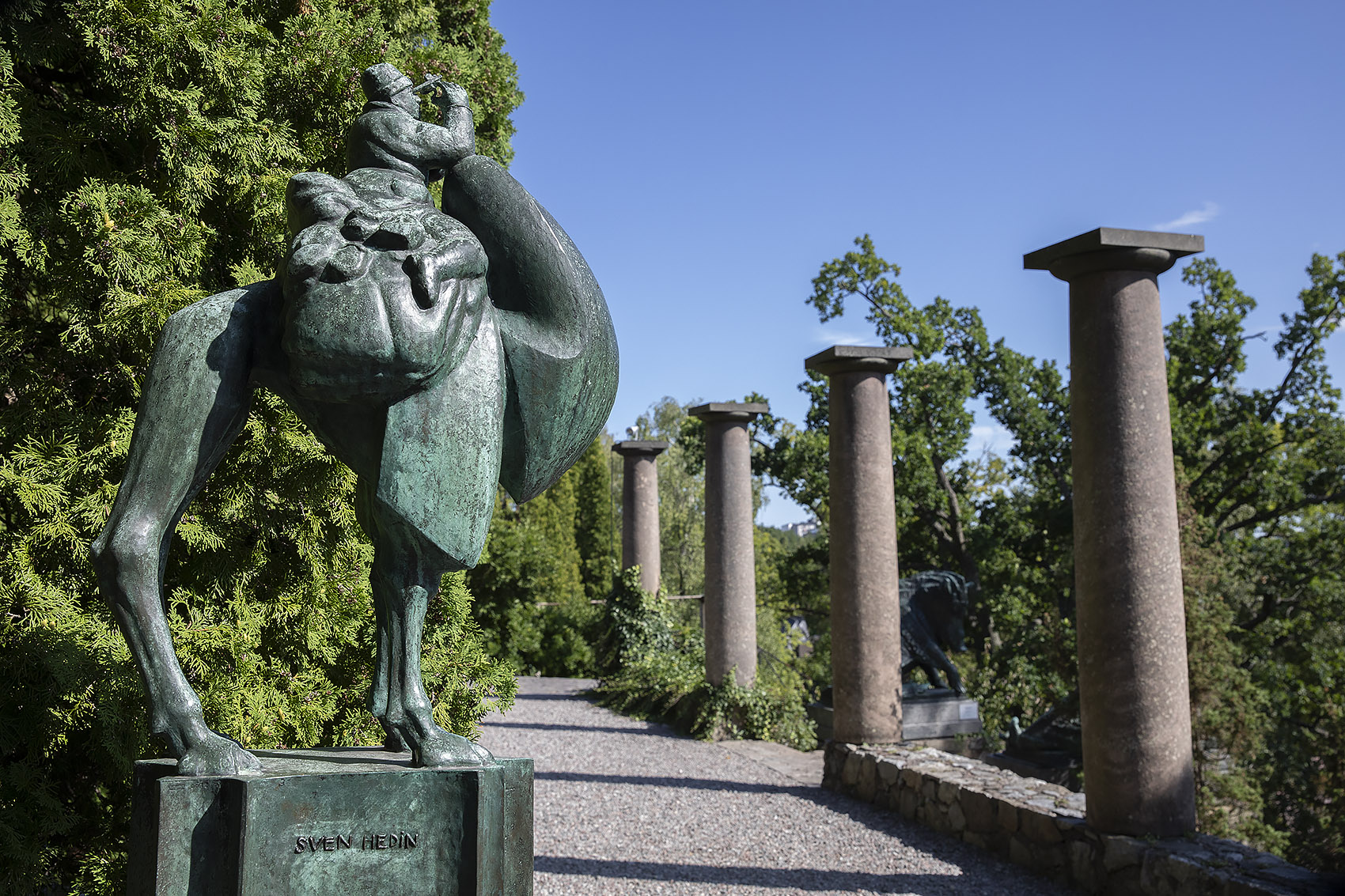 Efter konsthallen går man naturligtvis ut i den stora, vackra trädgården med alla sina växter, springbrunnar, trappor, vinklar och vrår – och förstås Milles skulpturer. En hjort tittar förvånat (eller förskräckt?) på mig, Skapelsens aktörer vandrar förbi, de sju manliga emigranterna (immigranterna?) har placerats på en stor fisk, Milles hade nog tänkt sig en andra fisk med sju kvinnliga emigranter, Guds hand, och så Sven Hedin. Här neutralt ridande på en kamel (eller dromedar?) avbildad som lantmätare på uppdrag på de centralasiatiska vidderna; men han var ju också så mycket annat. Författare av Gustav V:s statskuppsliknande borggårdstal 1914, rysshatare av samma kaliber och samma andas barn som dem man hör och ser idag, Hedin hetsade mot Ryssland redan före bolsjevikerna (sedan blev det förstås än värre) och så är det ju även idag, det är förstås en ilska mot angreppet på Ukraina men också något mer, en Karl XII-revanschism kryddad med antikommunism som blommat upp; för Hedins del slutade det med ett helhjärtat stöd till nazisterna. I frukostrummet pryds väggarna av holländskt 1600-tals kakel där barnen hoppar rep och roar Carl och Olga när de dricker sitt morgonkaffe, själva fick de aldrig några barn.