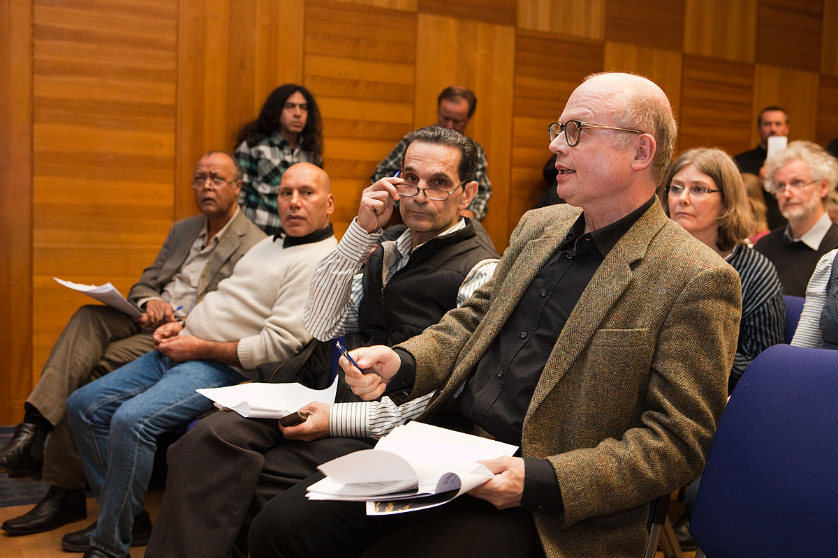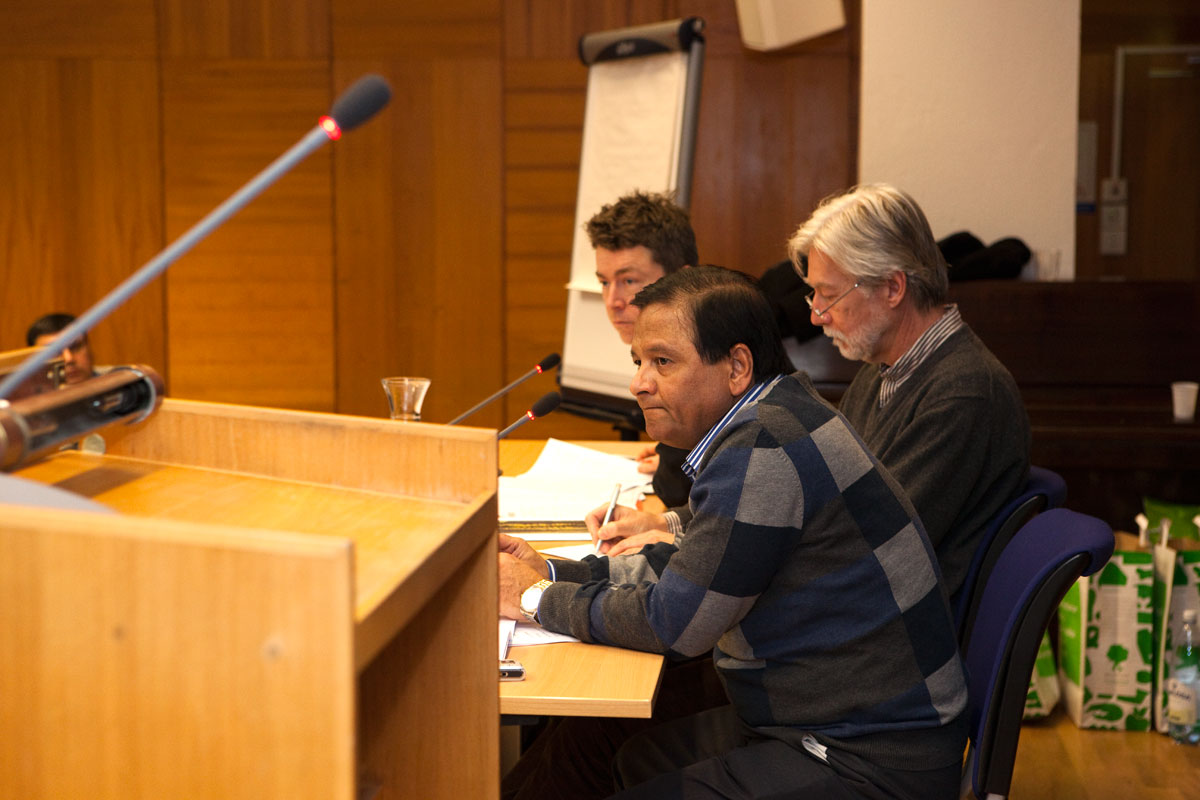 Ett strängt presidium vakar över församlingen: ordföranden Patrik Höglund (längst bort) sekreteraren Jan Gebring (i mitten) och bisittaren sektionsordföranden Mohibul Ezdani Khan