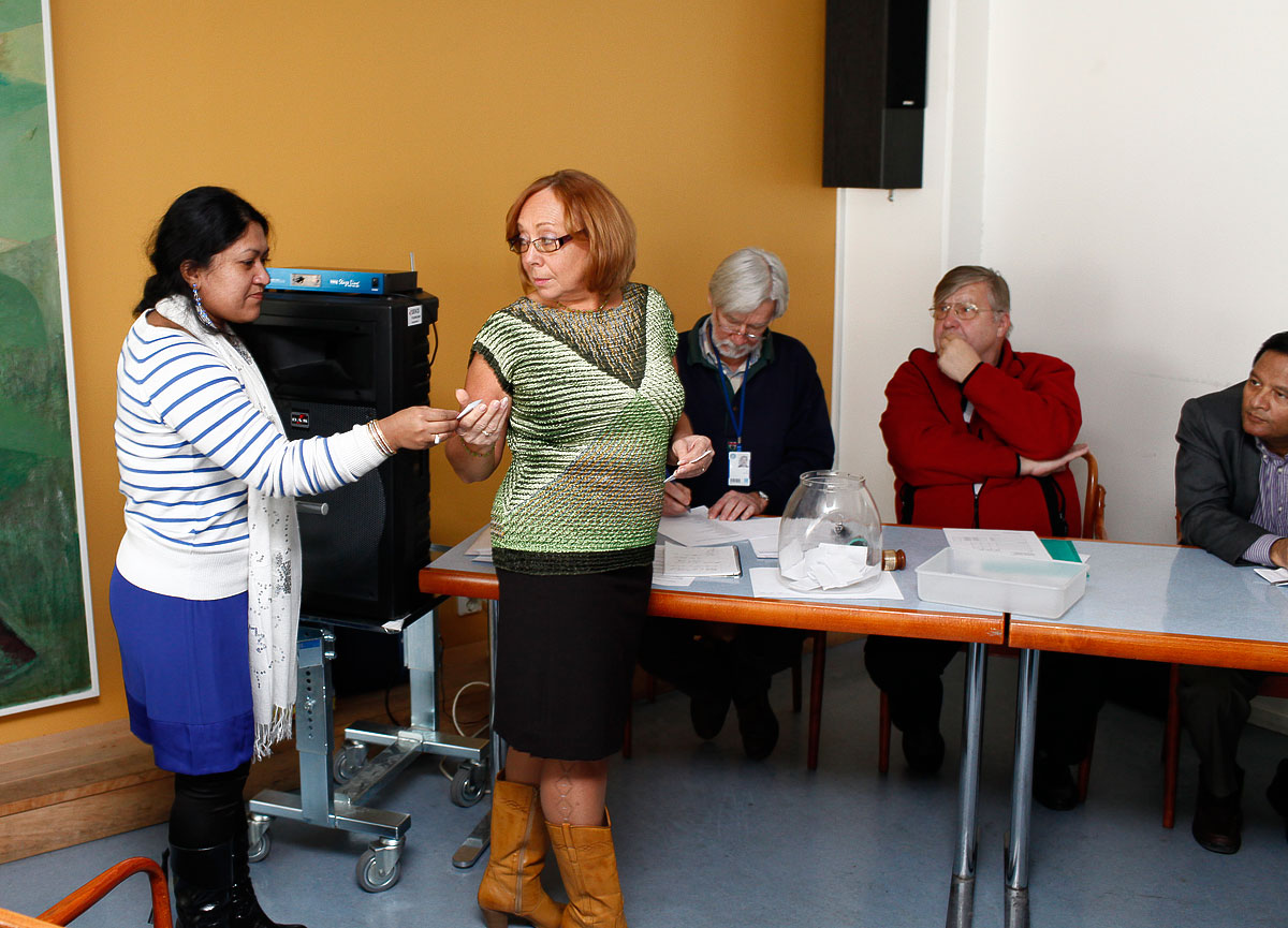 • att denne placerade valsedlarna från den första omgången i en bärkasse bakom presidiet