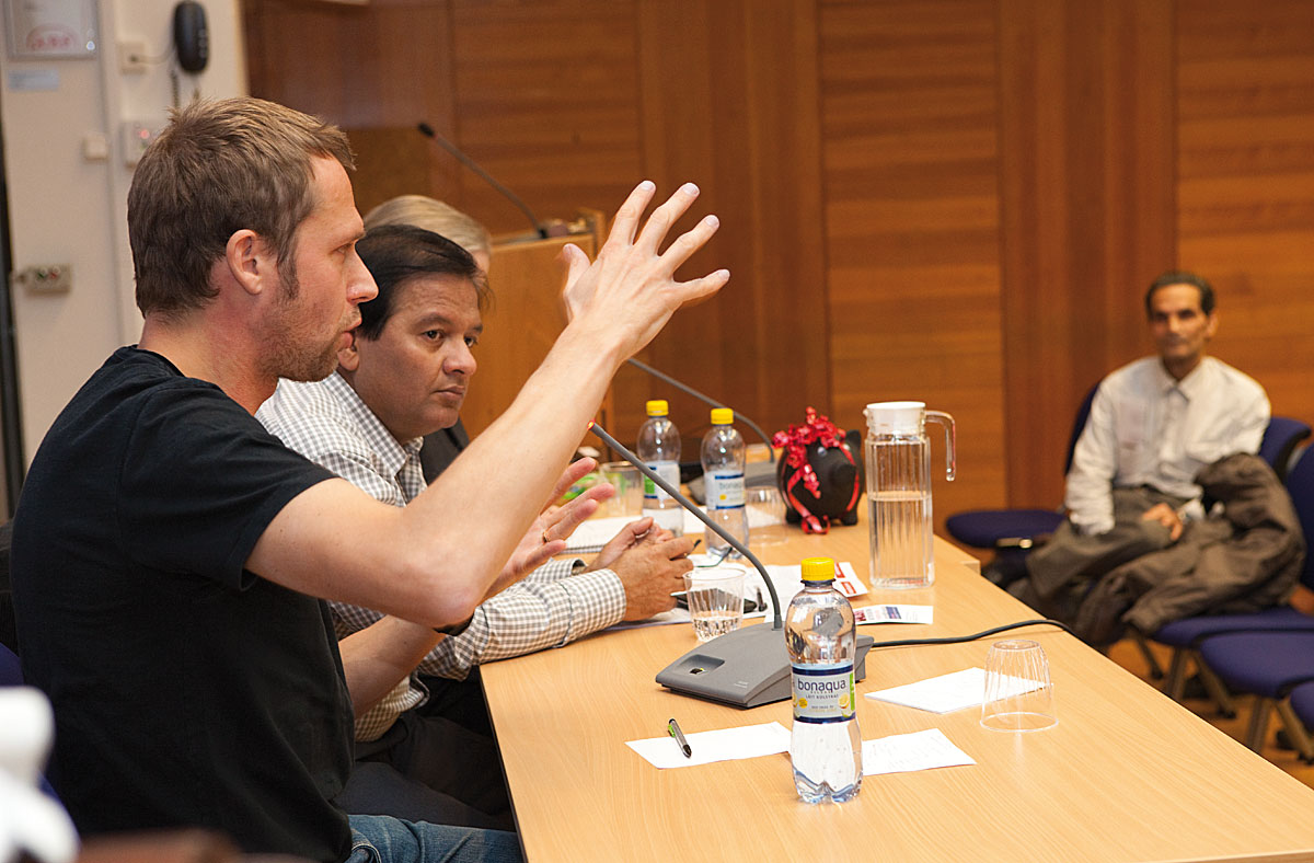 Vänsterpartiets Jens Holm var inbjuden talare. Bredvid honom Mohibul Ezdanikhan