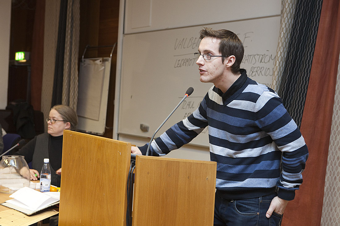 Maria Genou och Clas Eriksson presenterar de nominerade. Framför dem mötesordföranden Janne Alvebäck.