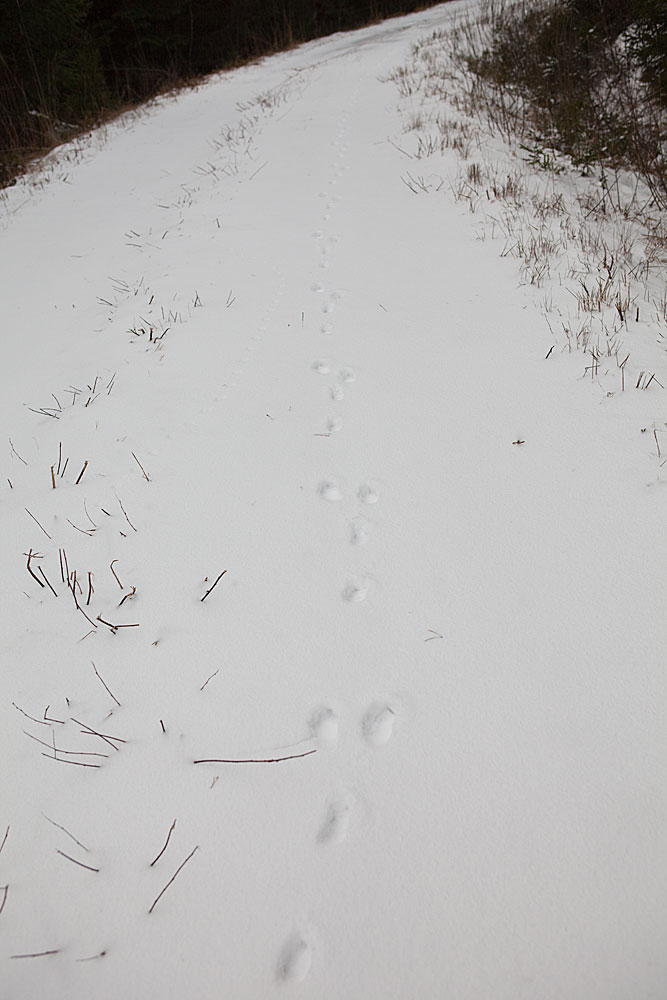 En hare längs vägen. Haren är aldrig särskilt talrik i de här fattiga markerna, men man ser spår efter dem här och där. Även relativt gott om rävspår och ekorre under dagens vandring. Men inte ett enda mårdspår. Det säger inte så mycket eftersom mården är litet lurig: Ena dagen ser man inte ett spår och nästa dag har de passerat vägen på de alla de vanliga ställena.