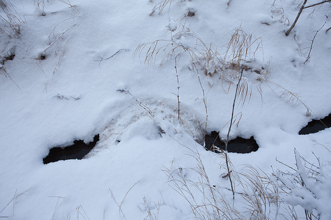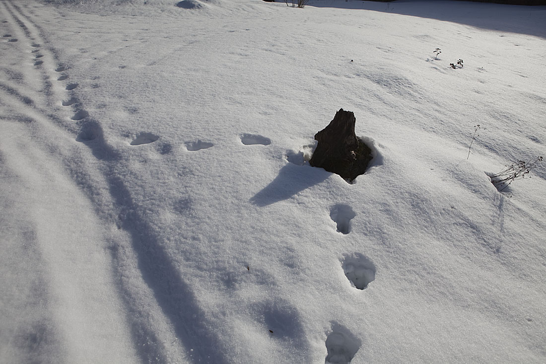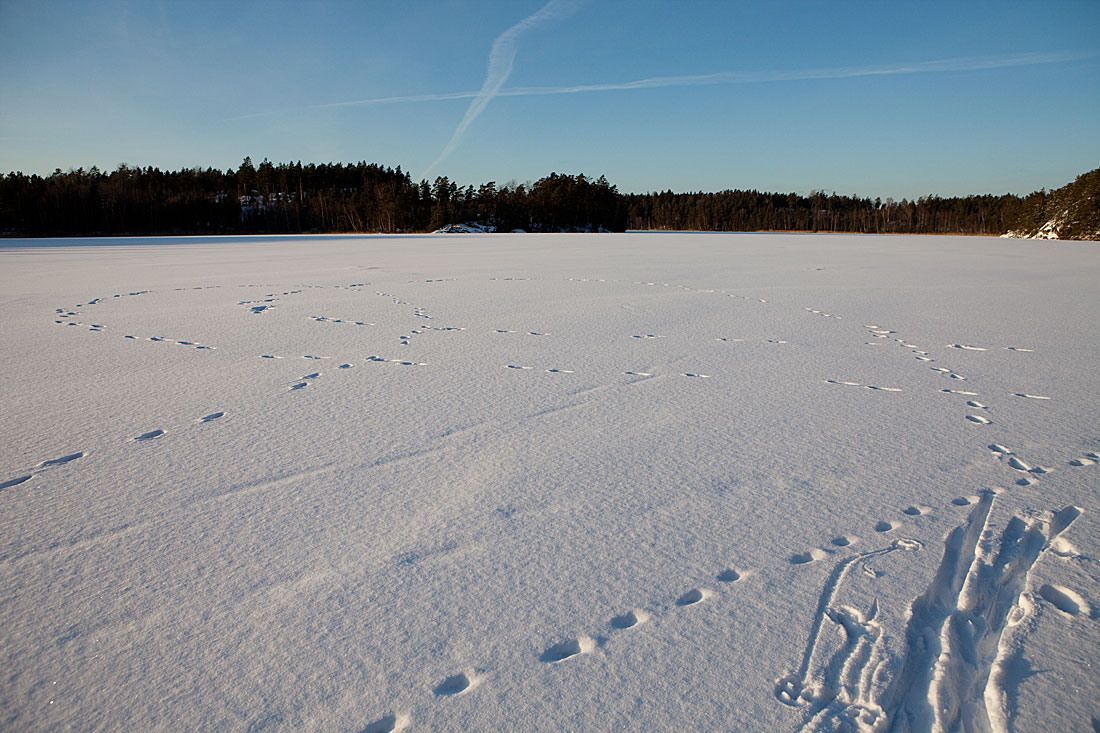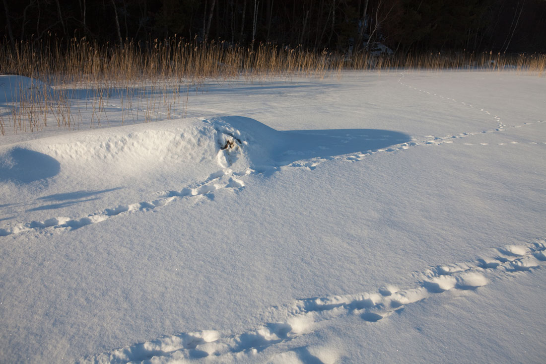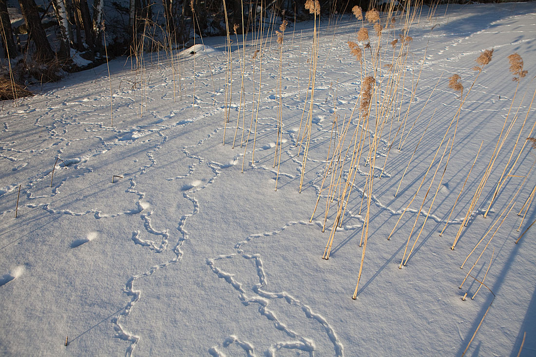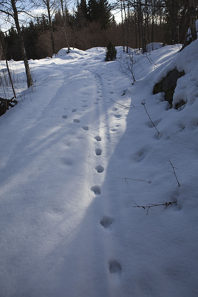 .. och på något ställe plogat upp ett spår i snön. Men inte som på uttrars vis åkt kanan nedför någon bergssida, men därmot sprungit långa sträckor en bit upp på land.