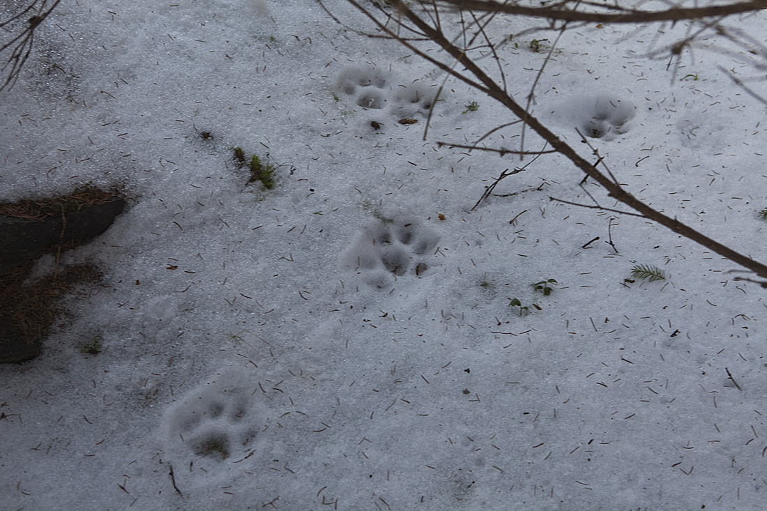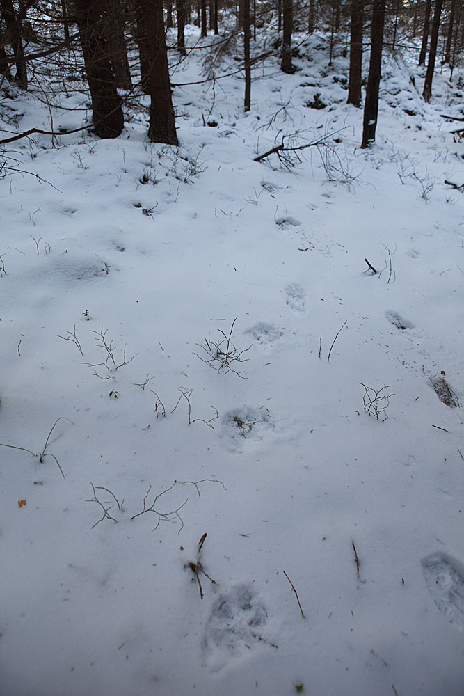 Den har gått över en liten tallmosse upp i berget med spänst i stegen, men utan att direkt ha jagat något djur. Kanske ett sätt att försöka skrämma upp de rådjur som finns i området?