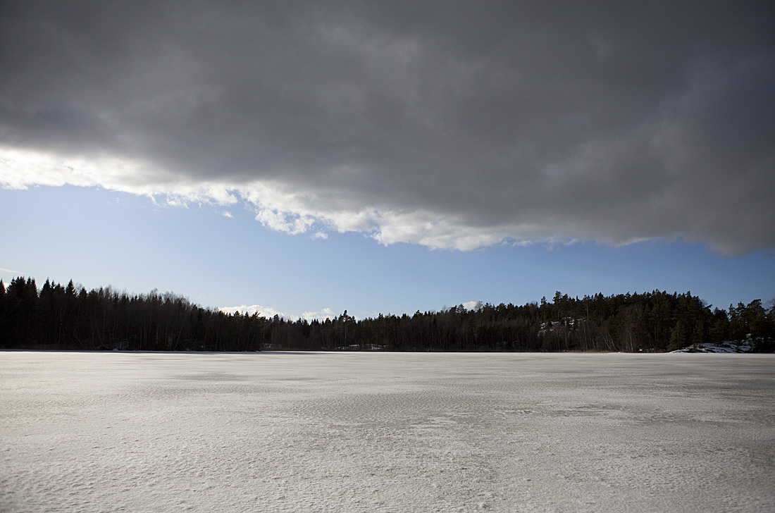 Igår när det var arbetsdag sol och rimfrost, idag återigen grått, grått, grått. Men lodjuret hade varit ute och knallat, troligen natten till igår. Här har den gått på isen på den stora sjön vid Torpet i skogen. 2012-02-11