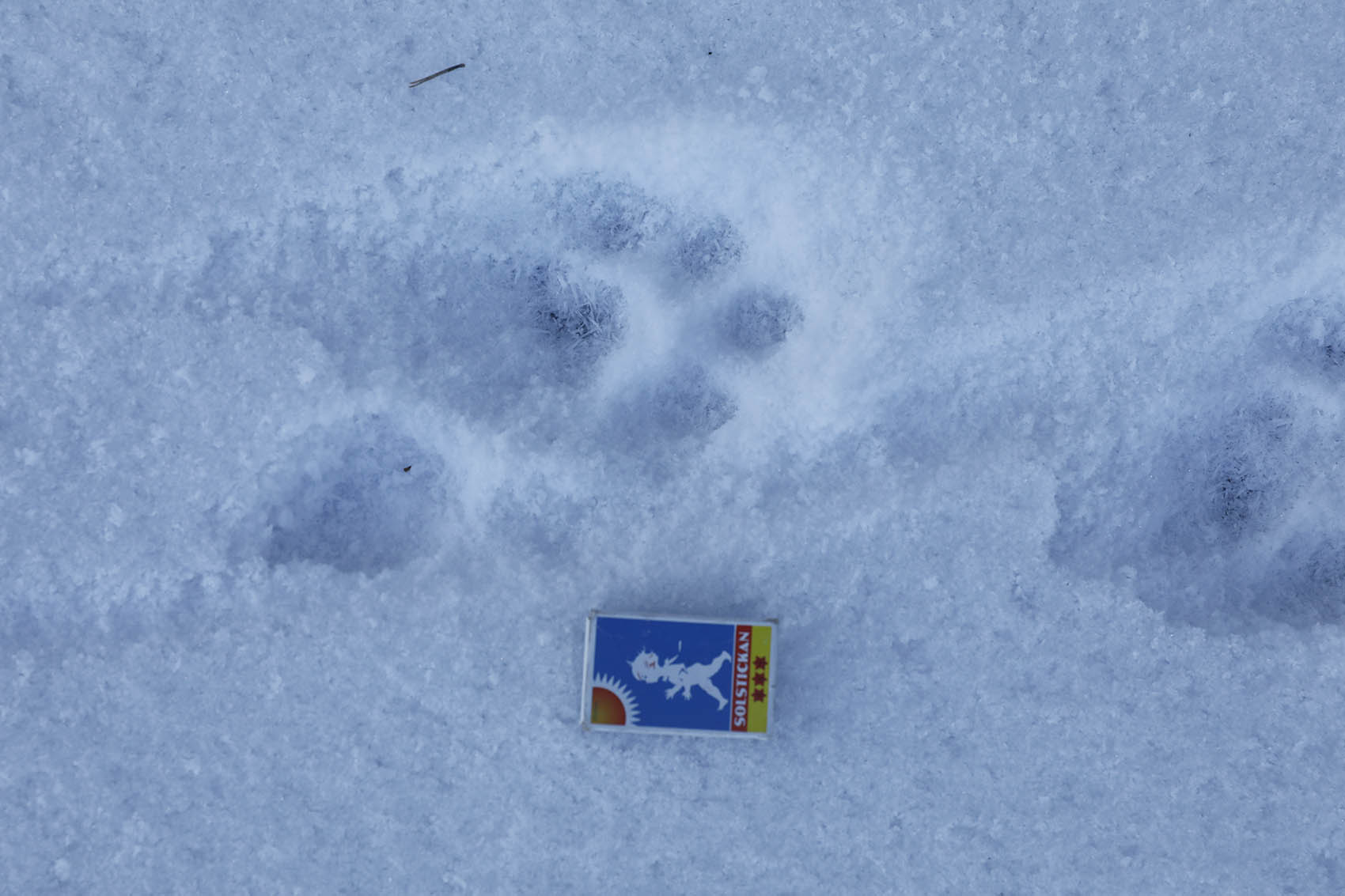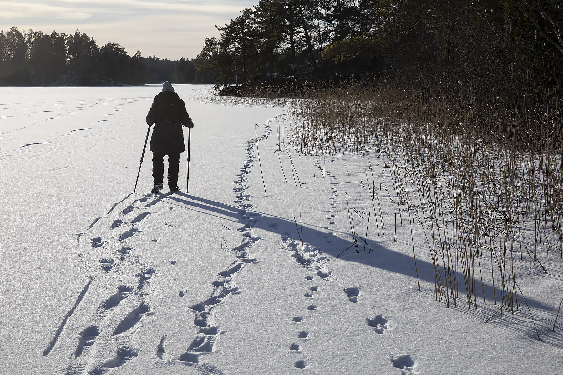 Det var då det. Idag sken solen hela dagen, det var -19 grader när vi kom ut och ett underbart väder att gå på isen. Man hade kunnat åka skidor, men dem hade vi lämnat hemma. Så många spår! Skridskoåkare förstås, ett helt gäng hade åkt runt sjöarna i lördags och några fiskare hade också varit ute. Och den bästa fiskaren av alla, uttern, hade sprungit längs sjön den natt som det snöade. Det är – dessvärre – gott om mink och deras spårstämplar syntes, både äldre och nattfärska, runt hela sjön.