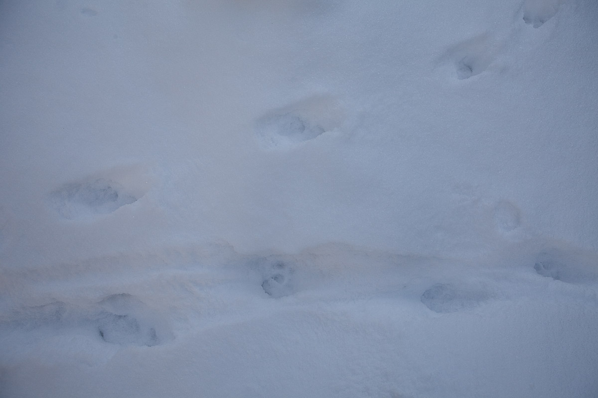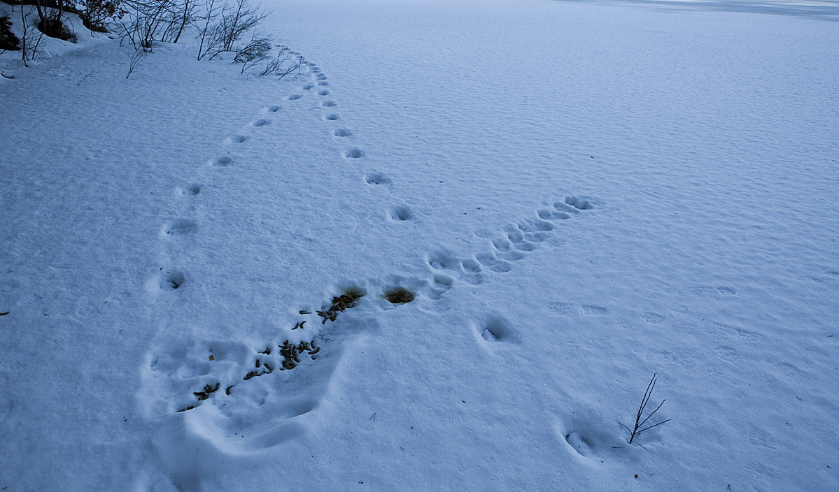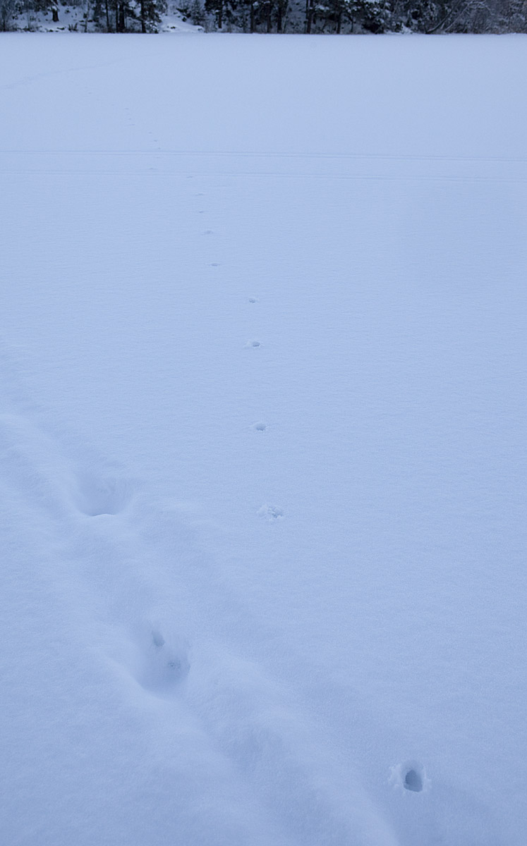 Ett spår som jag inte är riktigt säker på. Det stora nederst tv i bild är en av de tre älgar som gått över sjön, men det till höger? Antagligen en mus/sork som också gett sig ut på isen och gått över till andra sidan och med jämna mellanrum gått upp för att ... ja, vadå?