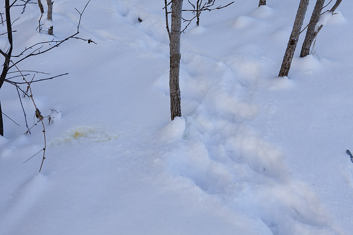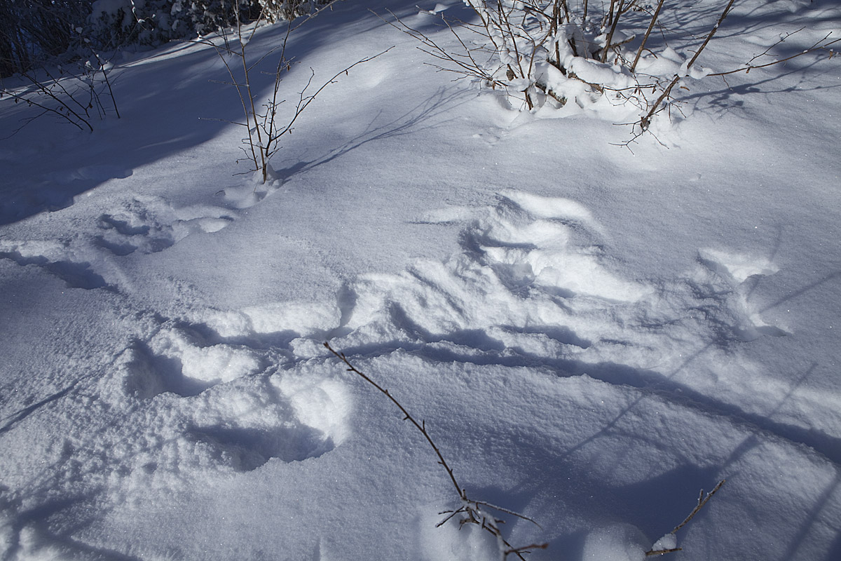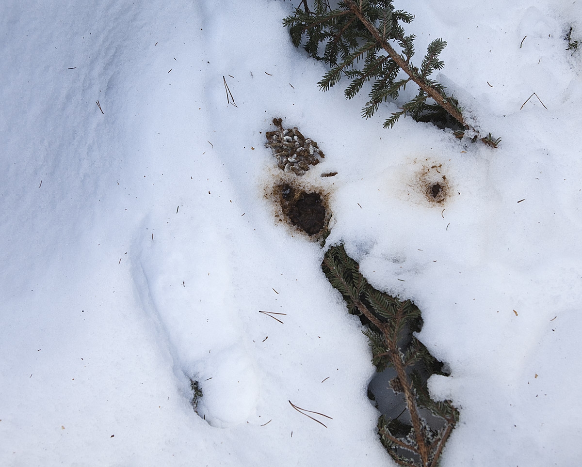... och här har järpen varit framme. I samma område som jag såg spåren den 14 januari. Järpen är lika ovanlig som tjädern i dagens skogar.