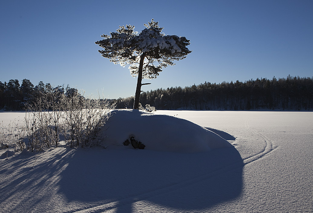 Det blir mest vinterbilder den här gången! Här den vackra tallen vid nästa sjö, där man fikat så många gånger, inte minst på den tiden då det fanns en rimlig chans att höra pärlugglan ropa i de här skogarna ...