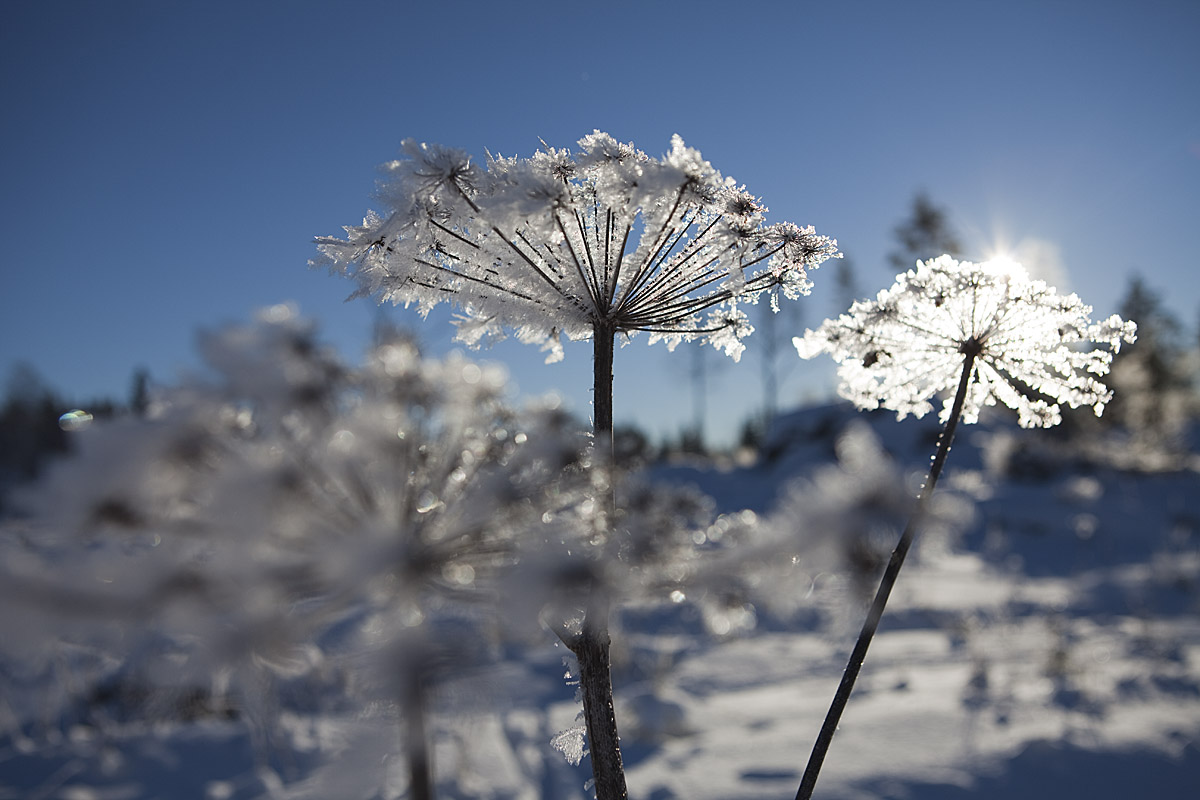 Jag lämnar spåret för den här gången och åker av sjön och tvärs över det stora hygget. Här en vinterståndare av björnloka som överlever ännu några år. Här stod en gammal kulturskog med en rik undervegetation i sänkorna.