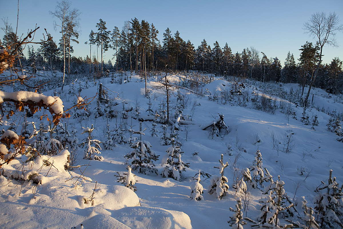 Vi avslutar dagen så som vi inledde den, med litet lodjursspårning -- av samma djur dessutom. Den har kommit söderifrån och jag kommer på spåret i skogen mellan två sjöar. Det har fortsatt norrut i samma bana som jag spårat lodjur tidigare. Jag har inte tid att följa längs spåret hela vägen utan gör "stickprov" där jag antar att den har gått, och det stämmer. Här har den kommit på ett stort hygge och på lodjursvis sökt sig upp på höga positioner och nu är den på väg ner från bergen i ena kanten av hygget ...