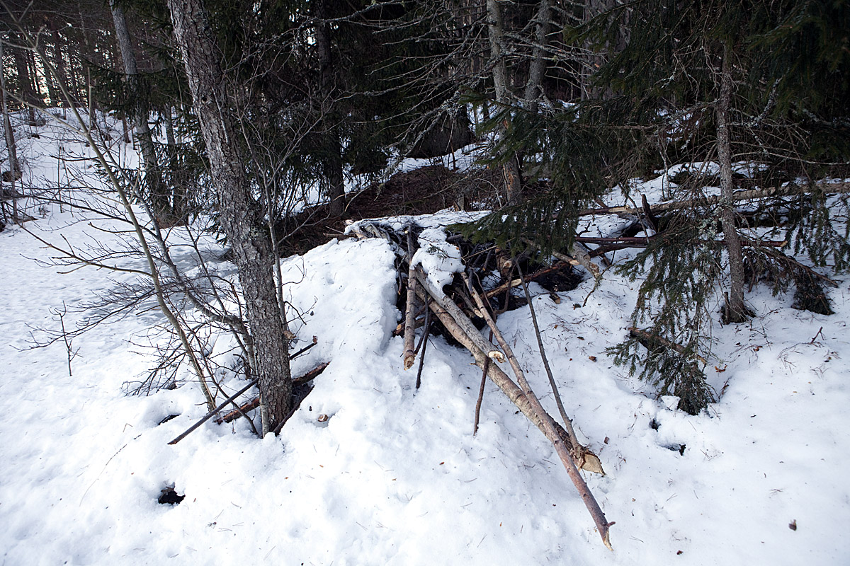 När jag ska tvära över en av uddarna i sjön upptäcker jag att två småbjörkar kapats nertill. Eftersom det inte finns något spill och inga andra träd i närheten tagits ner utgick jag ifrån att det var någon som huggit dem för att elda med, även om det är ovanligt vid de här sjöarna. När jag kommer ner på stranden på andra sidan halvön upptäcker jag en bäverhydda, diskret byggd i strandkanten. Den måste vara gjord sent i höstas eftersom det inte finns några andra träd fällda vid sjön än de som ingår i hyddan. Inte vad jag har sett i allal fall.