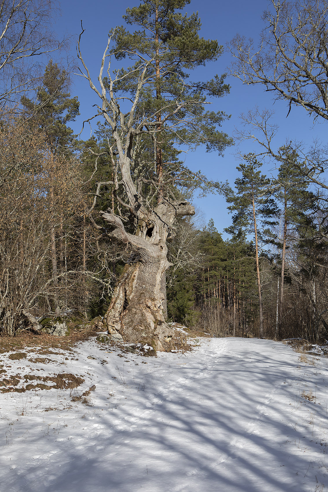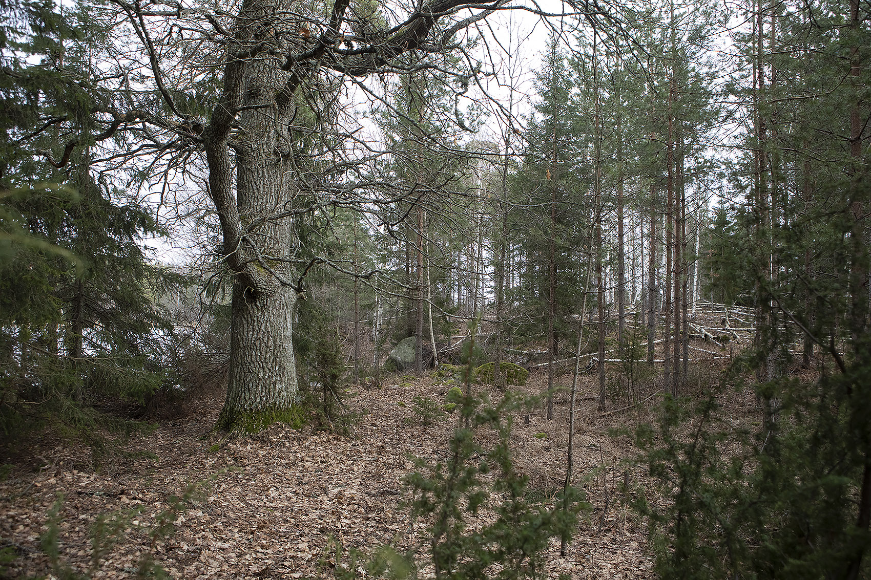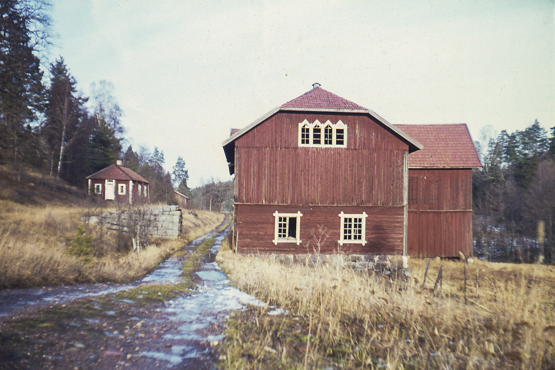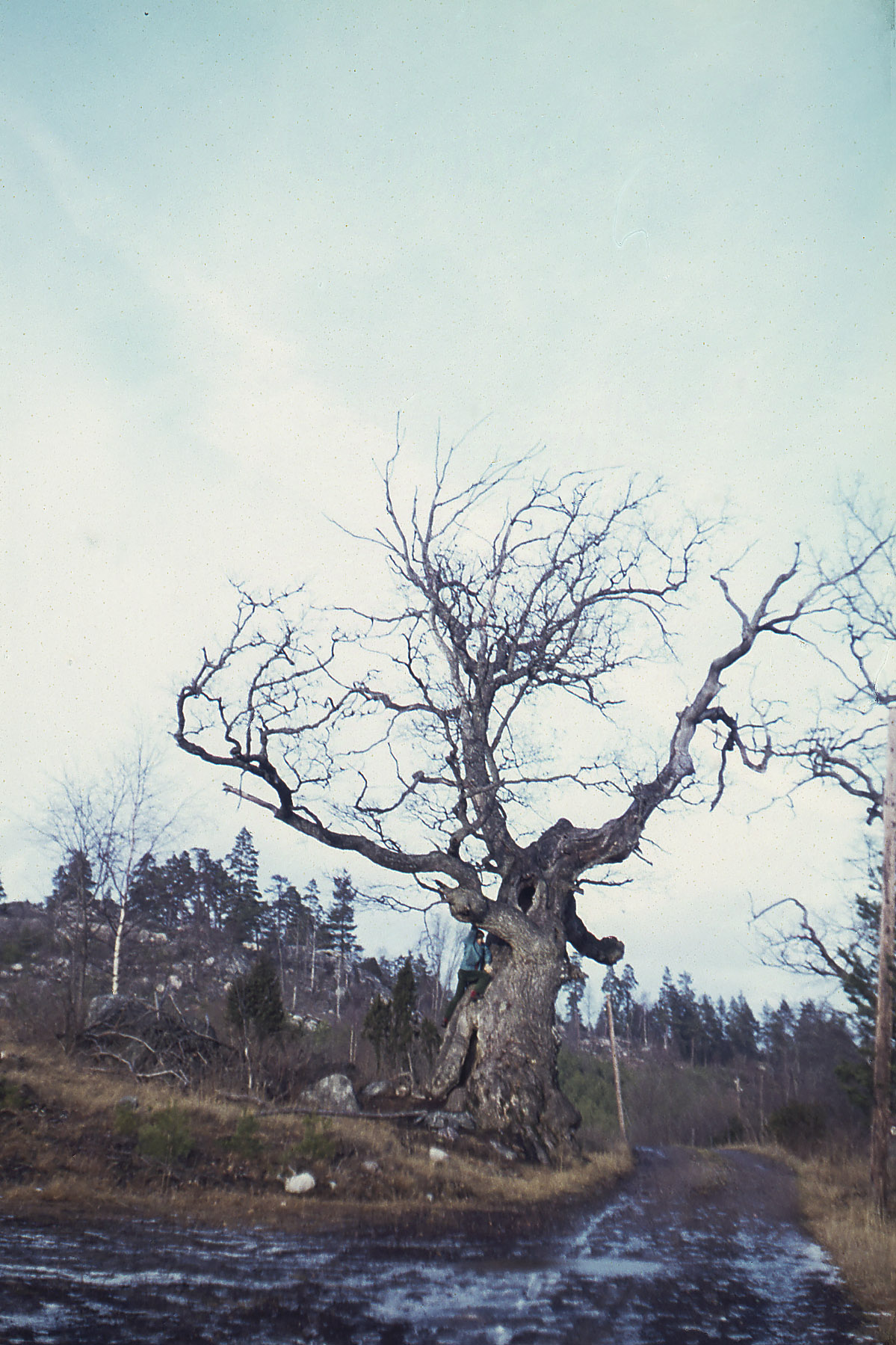 Jag var här första gången en bit in på 70-talet, tillsammans med E. Vi hade läst kartan och sett att det fanns ett naturreservat i skogen litet norr om gården, någonting som inte var särskilt vanligt på den tiden – då var fortfarande det mesta av skogarna i Roslagen naturreservat, utan att man behövde ha ett särskilt skydd för dem. Det har hänt mer på de senaste 45 åren än på de hundratals åren dessförinnan! Danvikens hospital, som äger marken sedan Gustav Vasas tid – han överförde gården till dem när han drog in Klara kloster – hade i alla fall satt av en hällmark med ovanligt grova och vackra tallar, och en liten skvattramsmosse nedanför. Det fanns ännu ett fiskgjusebo i en av tallarna.