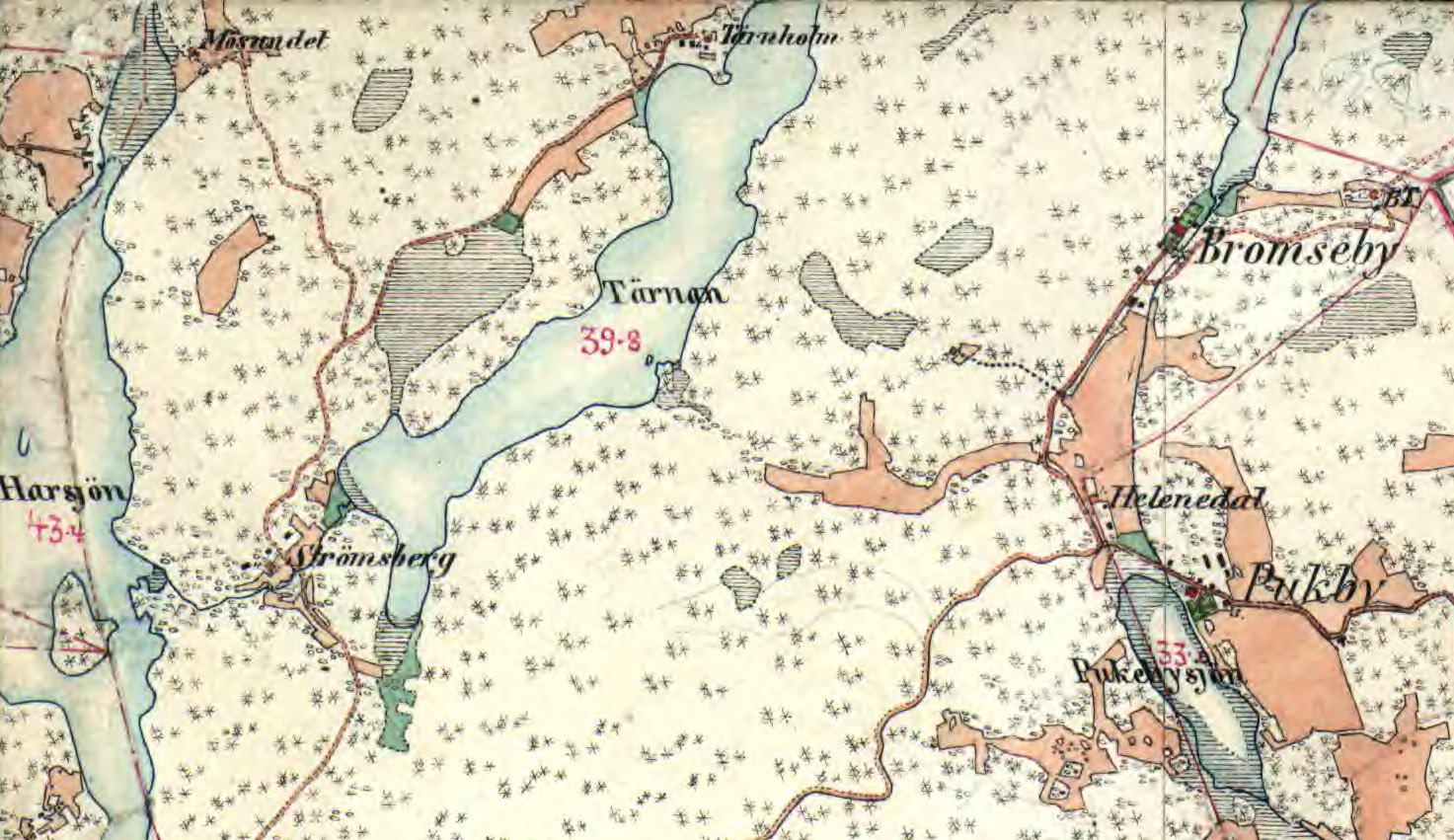 I jämnhöjd med Tärnholm, vid norra spetsen på Stora Harsjön fanns redan 1795 "Skogvaktartorpet", som idag heter Mösundet och ligger längs den väg som numera går i nord-sydlig riktning från Brollsta till Harsbro. Däremot fanns inte torpet Strömsberg vid den här tiden. Det tillkom under 1800-talet. (2021-03-06)