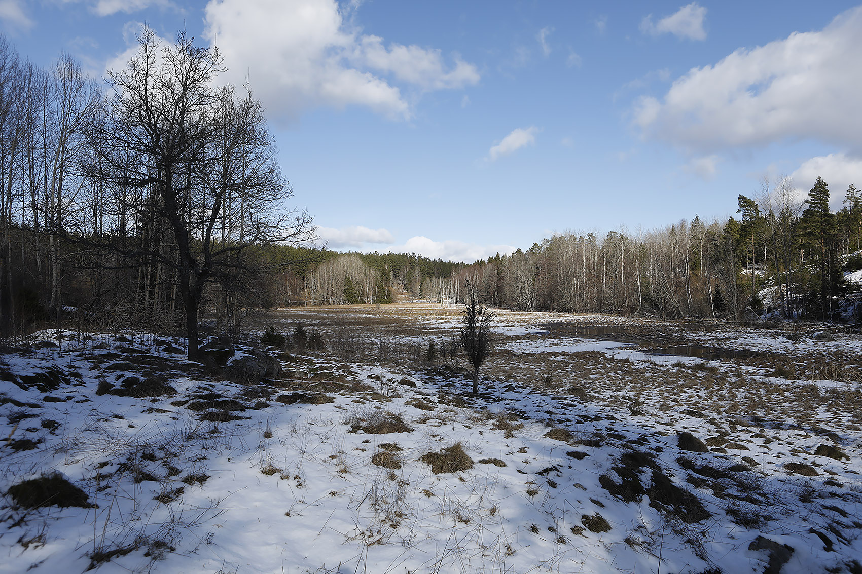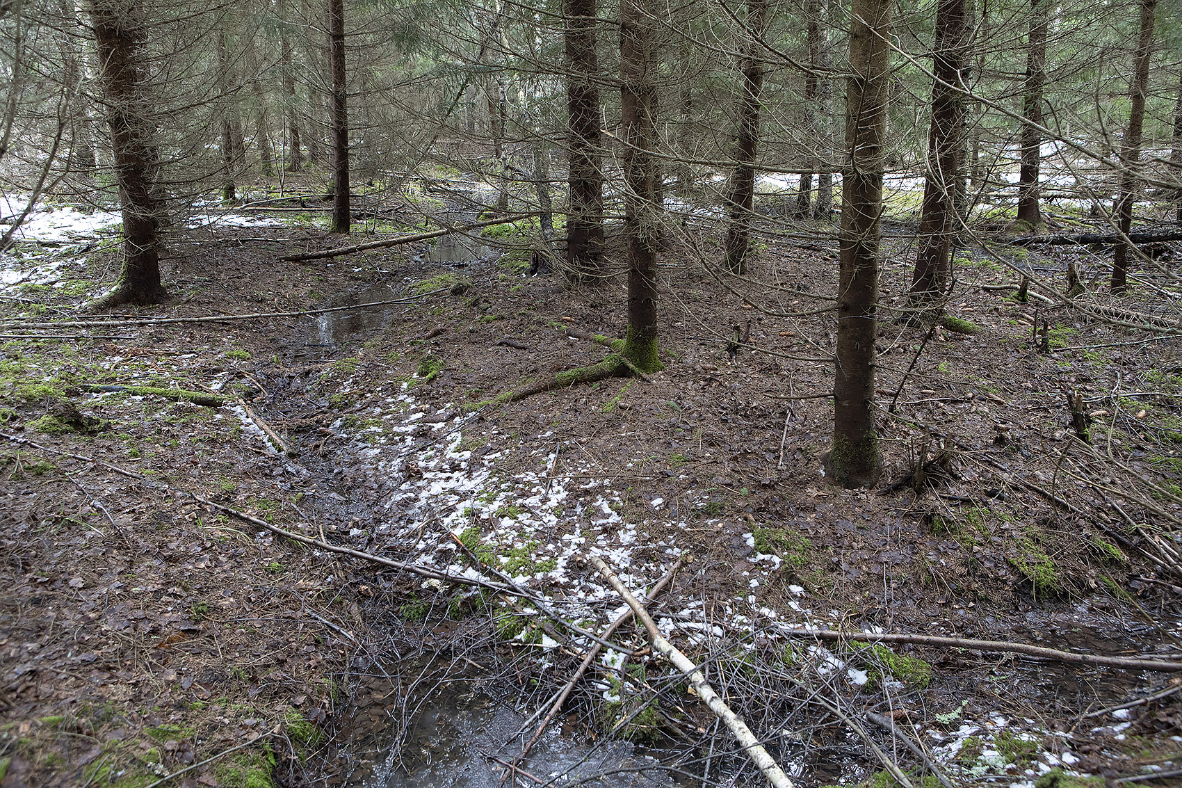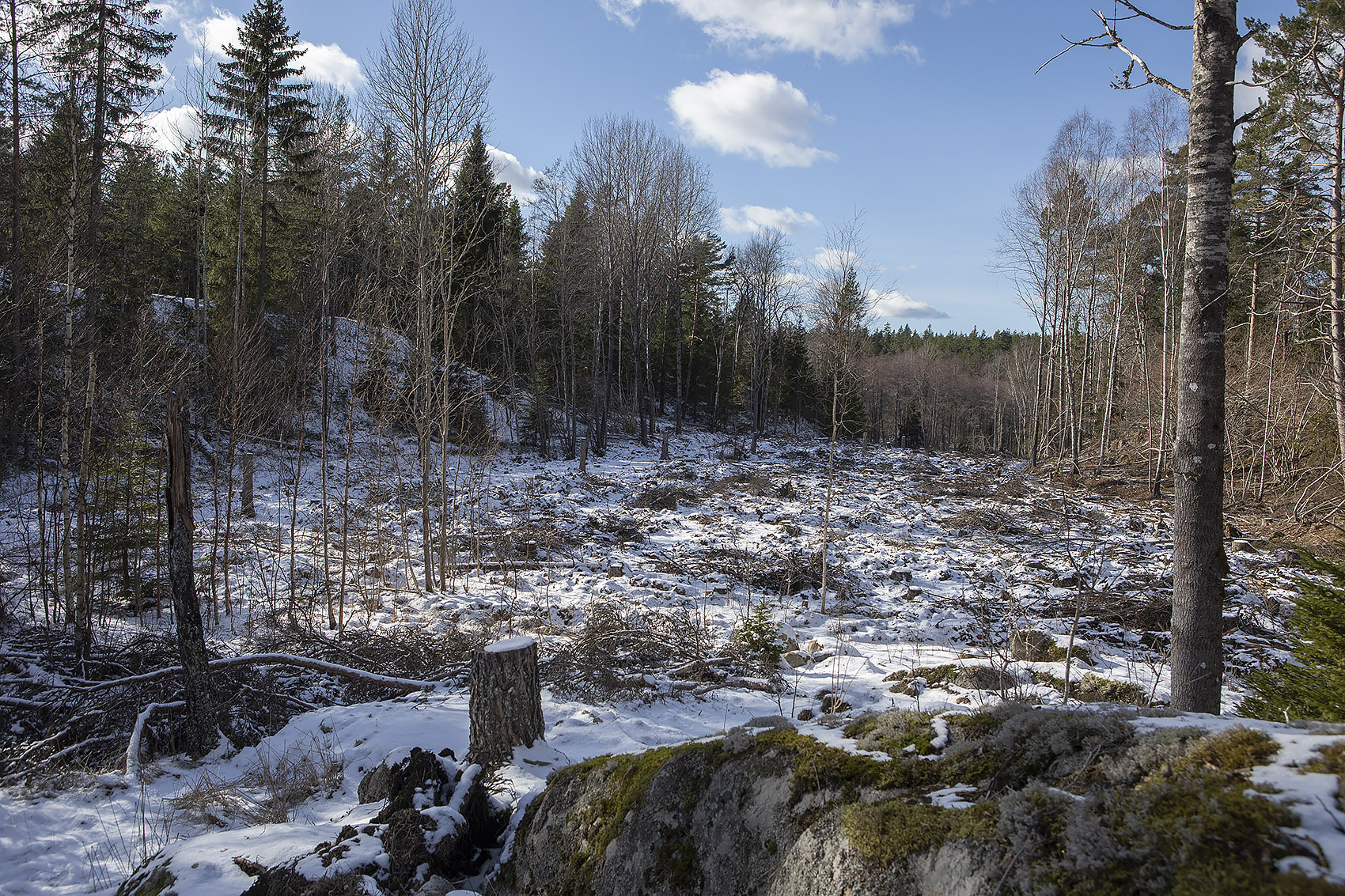 Långbrokärret, södra delen. Liksom den norra delen av kärret, eller kärren, tidigare utdikat och planterat. Kalhugget i vinter.