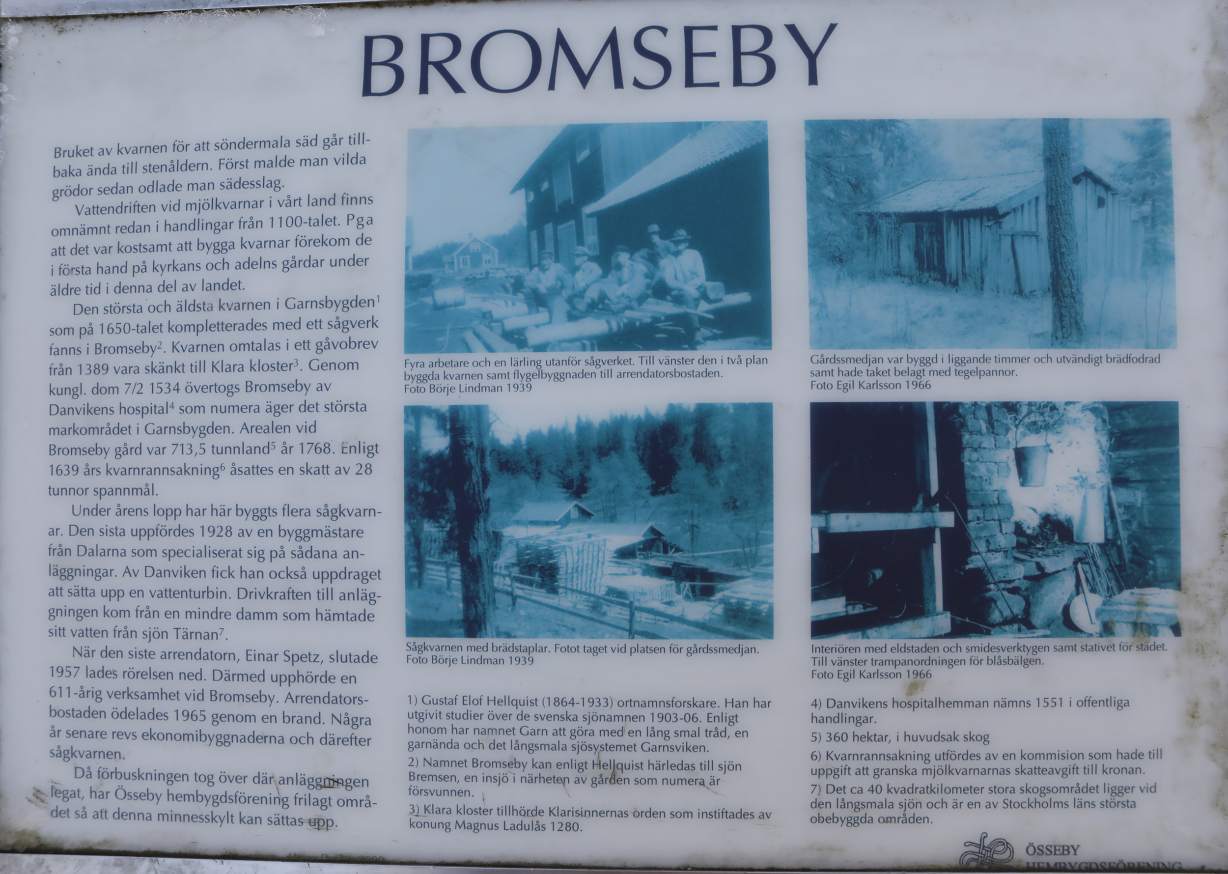 De två översta kartorna är från 1795, så vackert ritade av lantmätaren Per Lifman. På den nedre kartan ser vi det som vi idag förknippar med Bromseby, sågen och kvarnen och jordbruket som låg vid sjön Tärnans utlopp. Några ekonomibyggnader, dasset och Lilla Bromsebystugan stod kvar till för inte så länge sedan men är nu de alla rivna. Det återstår bara Hembygsföreningens skylt med information om Bromseby. Enligt Gods och gårdar från 1938 hade gården vid den tiden 3 hästar, 10 kor, 5 ungdjur, 1 tjur, 2 svin och 10 höns, samtidigt som man drev såg och hyvleri.