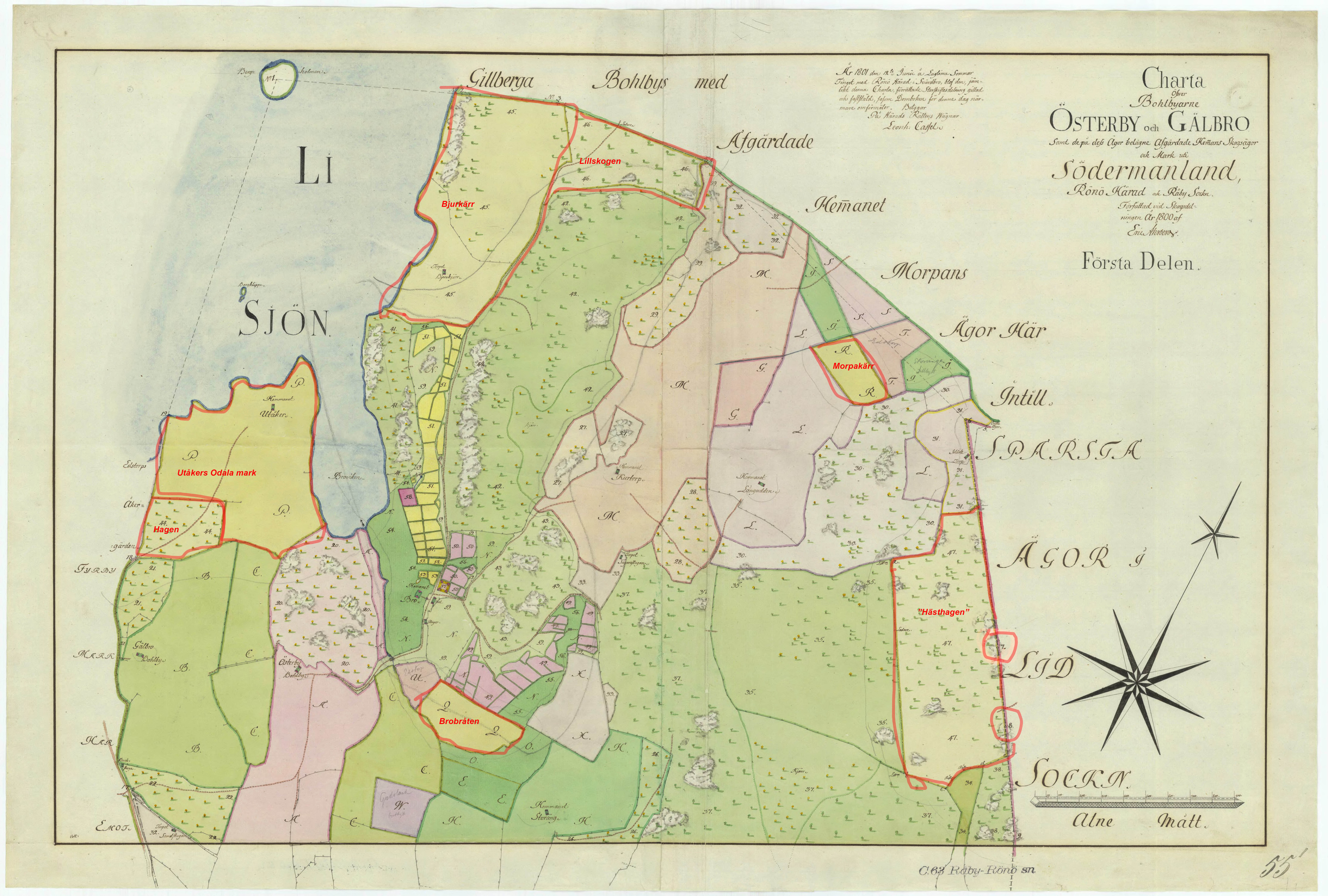 . Där har jag ritat in och skrivit ut namnen på de skiften som tillföll Utåker. Den södra delen av kartan finns