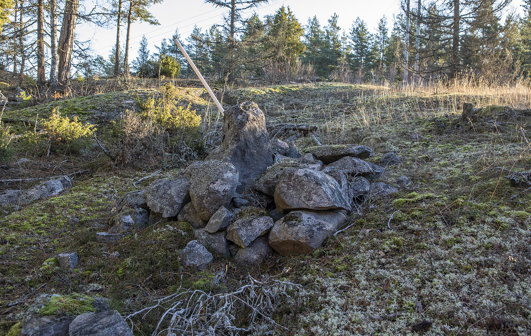 No 8. Berg Stafven kallad en stor tjock något flatsidig sten 51/2 qtr lång i en ringrösa omskolad på Norra sluttningen af ett berg, Söder om en däld och en liten väg, som går till Hemmanet Gålsjön, visar – linen efter dess flator tillbakas till No 7.”